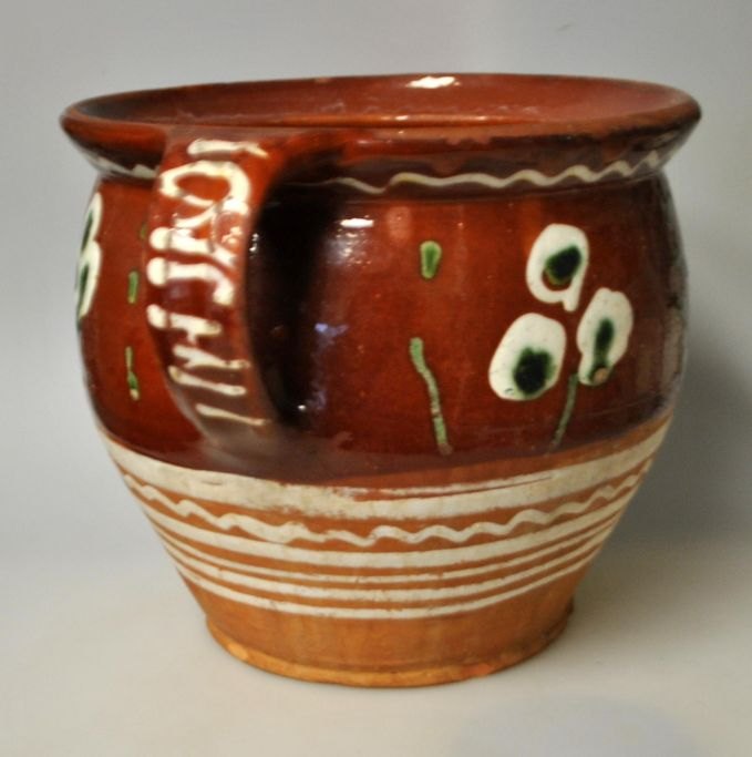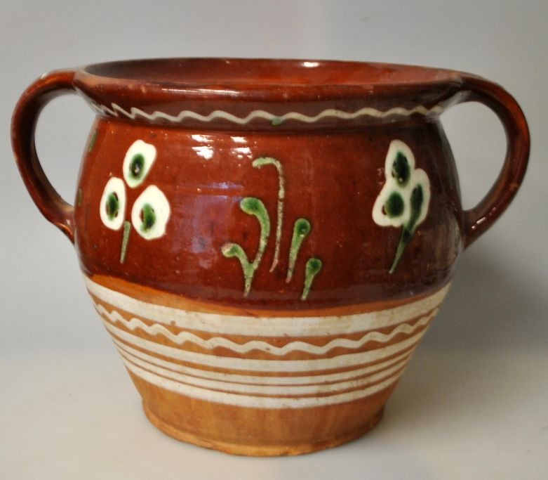 Two-handled jar with brown exterior coating, Sorring, ca. 1870, Denmark. Decorated with flowers. H.: 18 cm. Dia.: 20 cm.Item number: 28810
