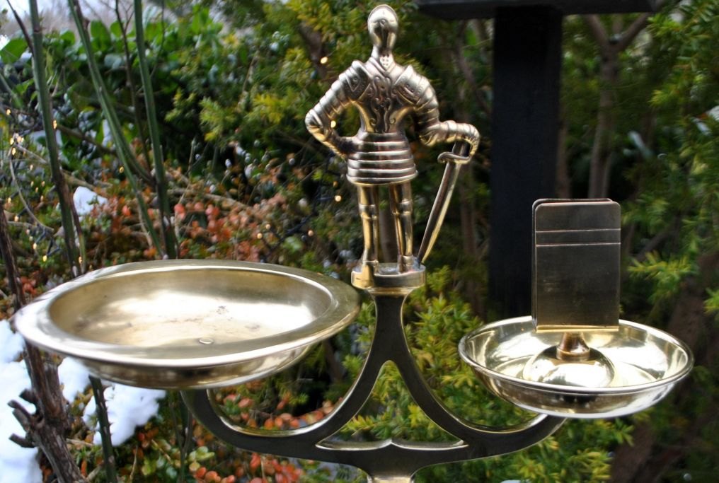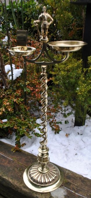 Brass stand with ashtray and match holder, 19th century. With double-twisted column and on top decorated with a knight in armor. On a round foot. H: 86 cm. W: 32 cm.Item number: 28931