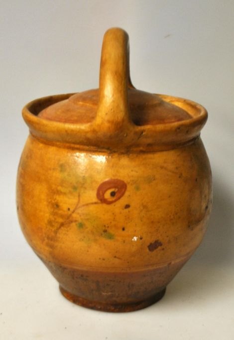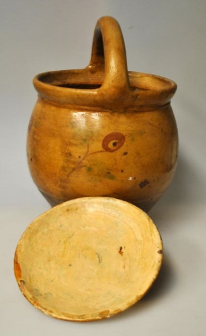 Sorring maternity pot, circa 1860 - 1870. Sorring near Silkeborg, Denmark. With warm yellow glaze. Decorated with flowers. Height with handle: 21 cm.