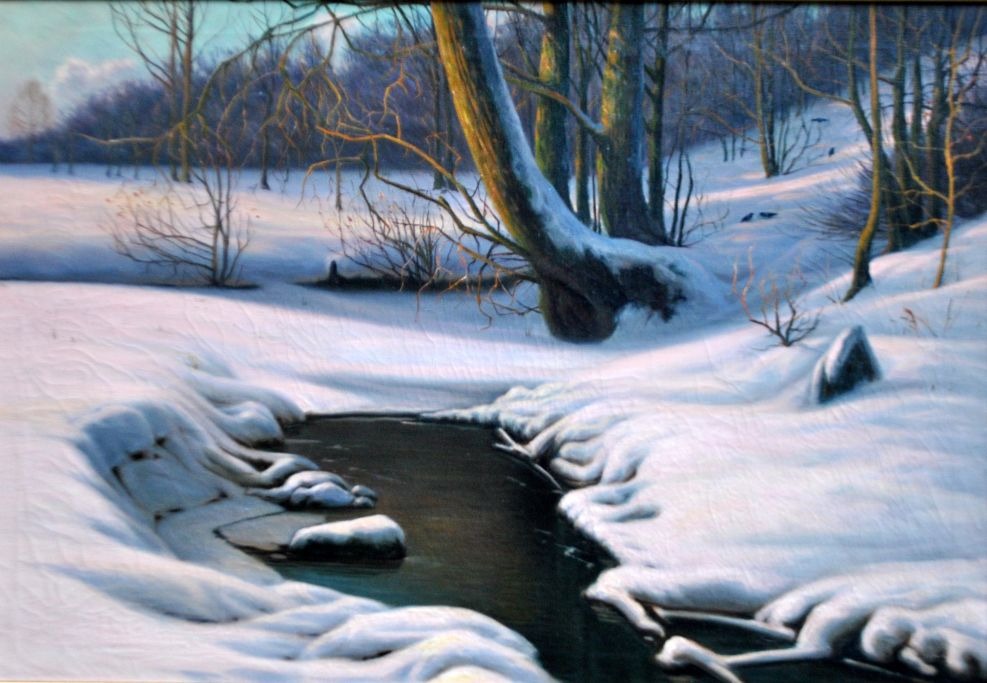 Wang, Albert (1864 - 1930) Denmark: Snow landscape. Oil on canvas. Signed: A. Wang. H: 67 cm. W: 95 cm.Framed: H: 82 cm. W: 113 cm.