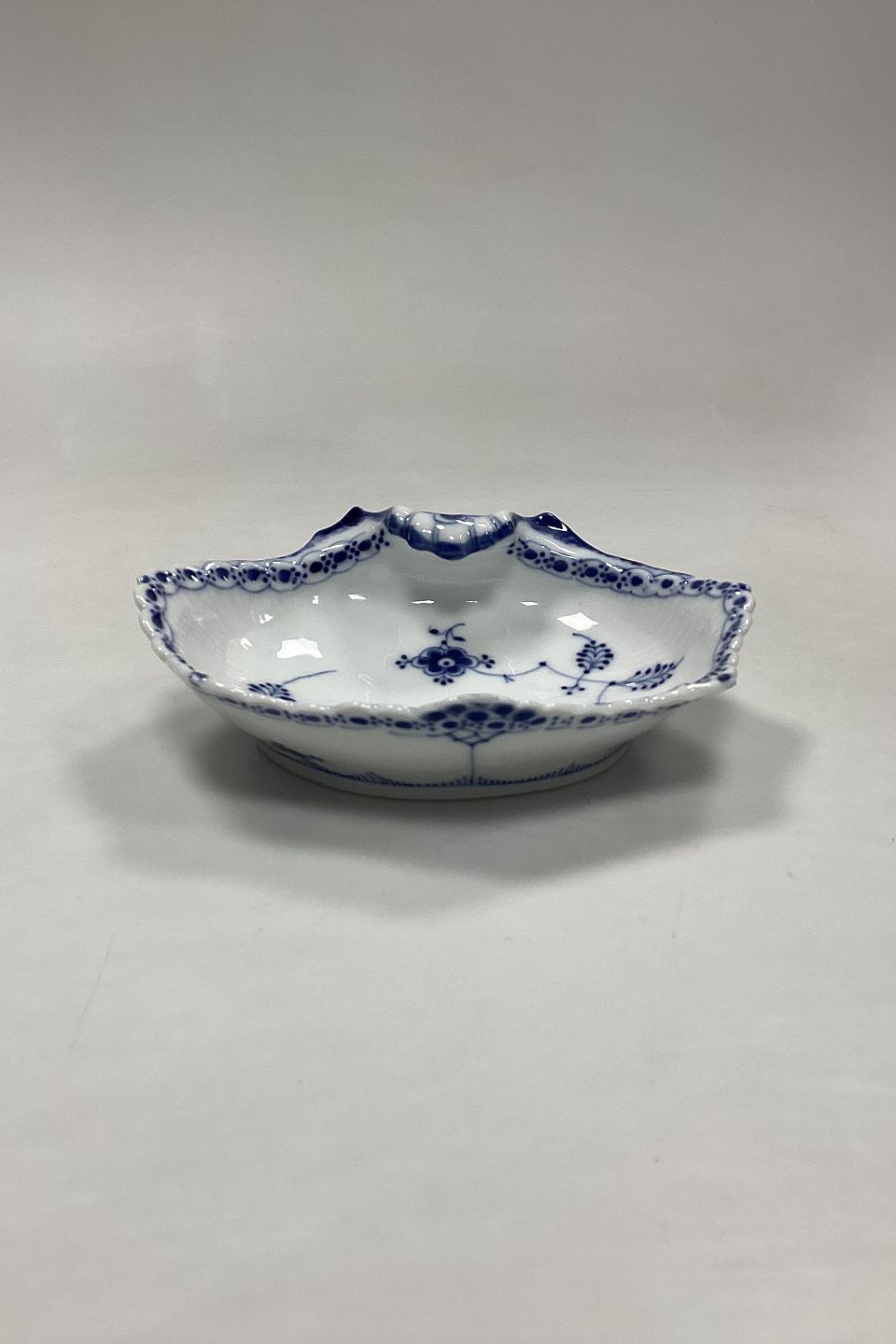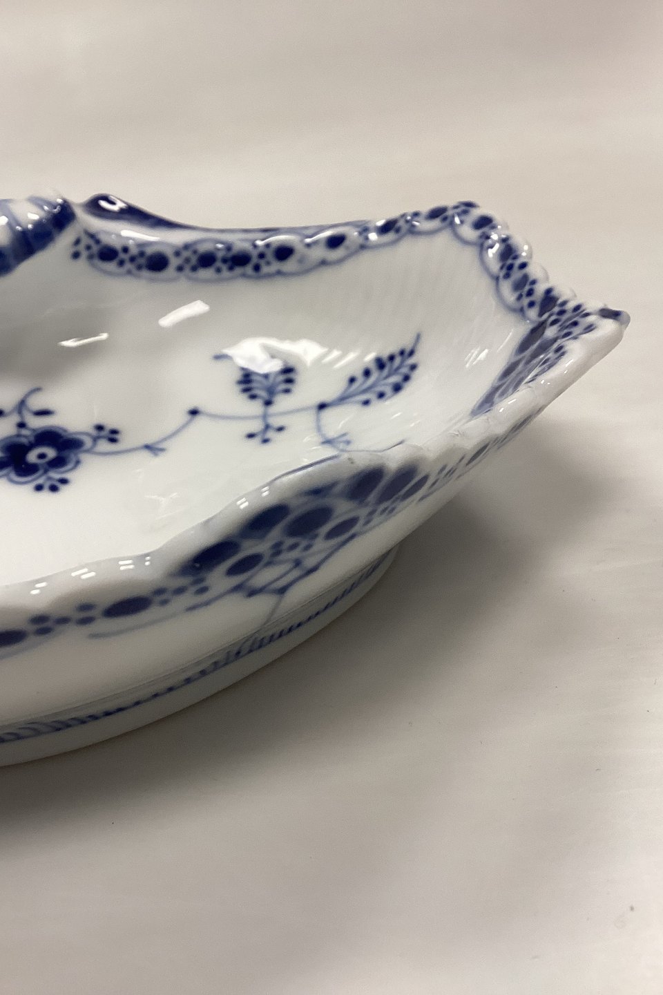 Royal Copenhagen Blue Fluted Half Lace Mussel-shaped Bowl No. 556. Grinding on the front dent, see photo.