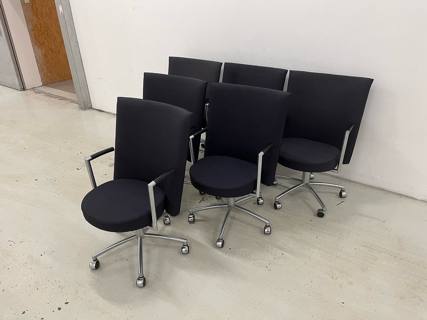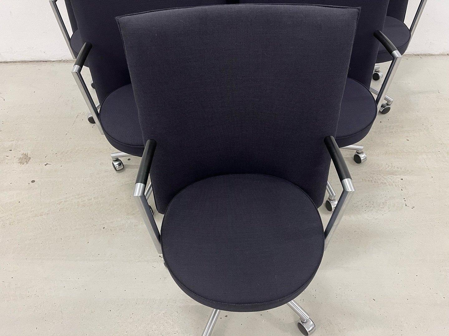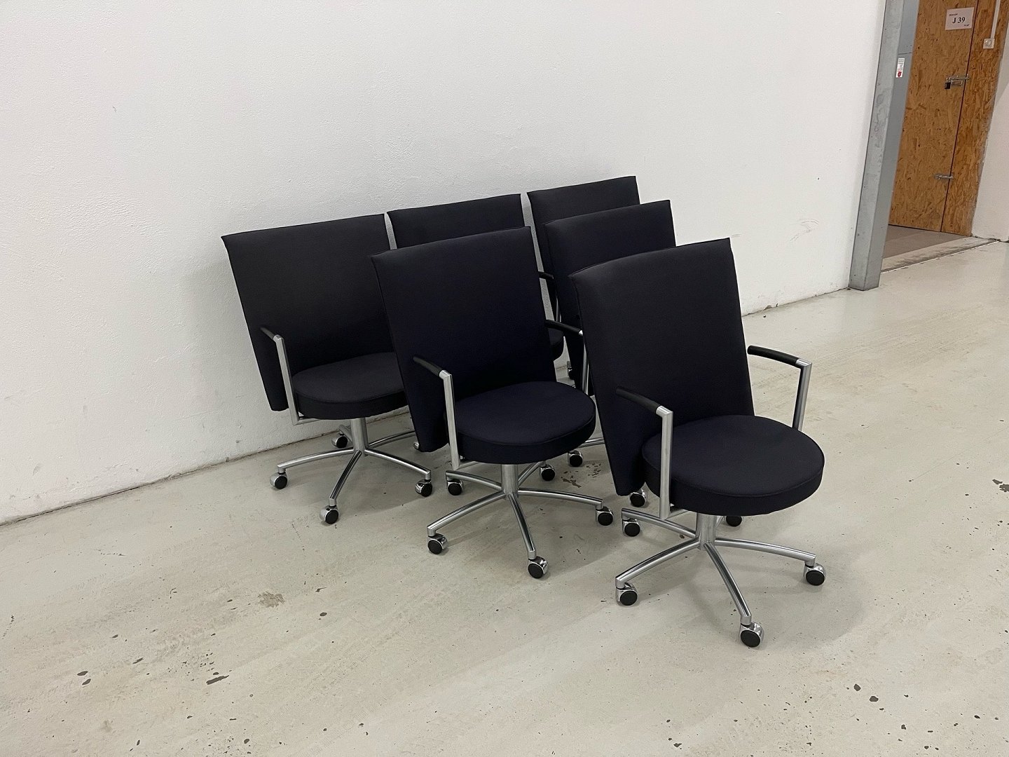 1.310Erik Jørgensen EJ-70 �Partner� lounge chairs 6 pcs.EJ-70 �Partner� is a classic Danish designed lounge chair produced by furniture manufacturer Erik Jørgensen. The model was designed by the renowned Danish design duo Johannes Foersom & Peter Hiort-Lorenzen in the 1990s and has since achieved status as a sought-after design classic, used in both private homes and exclusive lounge and business environments.The chairs are made of black/blue upholstered fabric with a frame in matt chrome-plated steel. Original new price per chair: DKK 18,995. There are a total of 6 pieces, which are sold together in sets of 2, 4 or 6 pieces.The chairs are supplied with both wheels and fixed glides, which are included.Price per set: DKK 11,500,-Dimensions:Height: 93 cmWidth: 72 cmDepth: 79 cmSeat height: 43 cm⸻Our concept� Professional purchase of newer and used quality furniture� Thorough cleaning and treatment with focus on the integrity and long durability of the materials