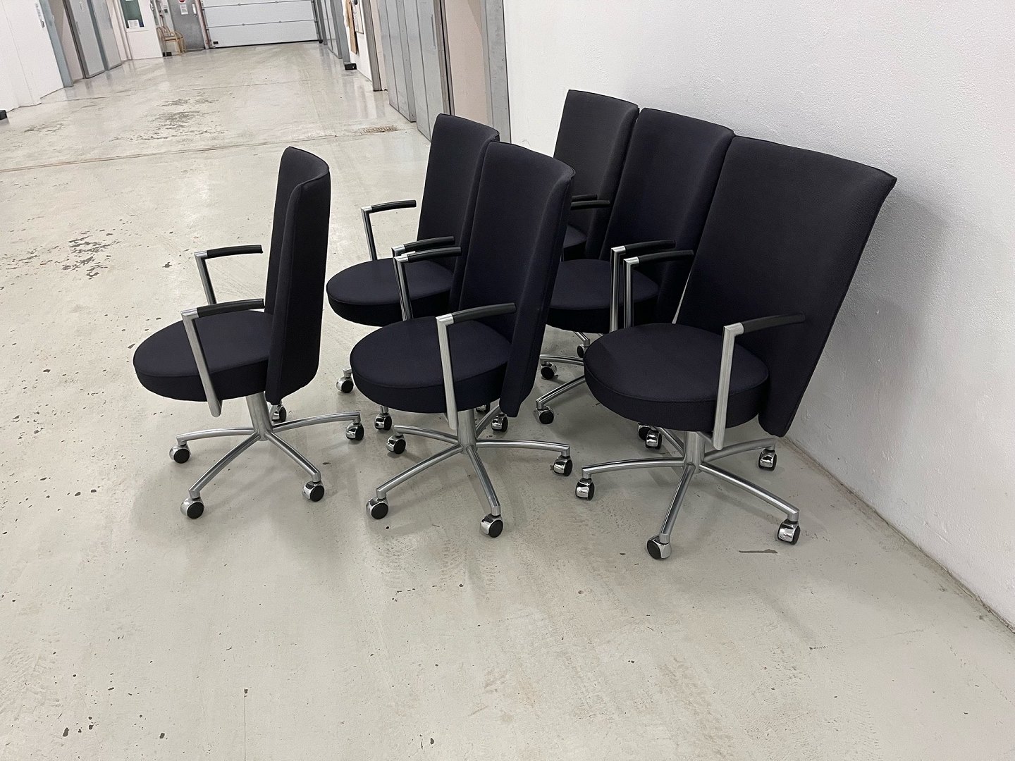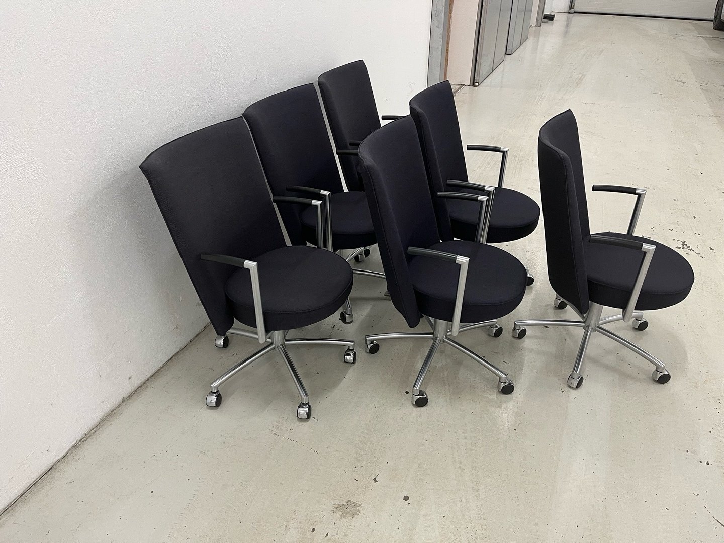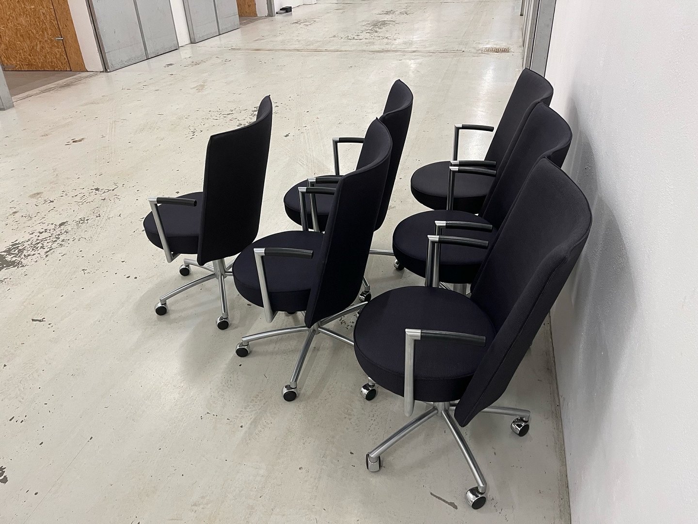 1.310Erik Jørgensen EJ-70 �Partner� lounge chairs 6 pcs.EJ-70 �Partner� is a classic Danish designed lounge chair produced by furniture manufacturer Erik Jørgensen. The model was designed by the renowned Danish design duo Johannes Foersom & Peter Hiort-Lorenzen in the 1990s and has since achieved status as a sought-after design classic, used in both private homes and exclusive lounge and business environments.The chairs are made of black/blue upholstered fabric with a frame in matt chrome-plated steel. Original new price per chair: DKK 18,995. There are a total of 6 pieces, which are sold together in sets of 2, 4 or 6 pieces.The chairs are supplied with both wheels and fixed glides, which are included.Price per set: DKK 11,500,-Dimensions:Height: 93 cmWidth: 72 cmDepth: 79 cmSeat height: 43 cm⸻Our concept� Professional purchase of newer and used quality furniture� Thorough cleaning and treatment with focus on the integrity and long durability of the materials