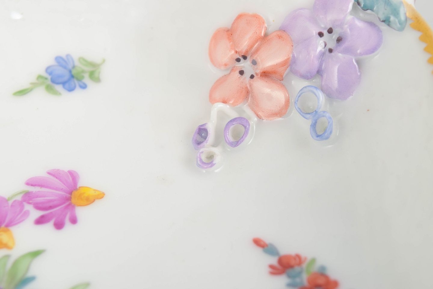 Leaf-shaped serving dish in white-glazed porcelain with hand-painted floral decoration from the Saxon Flower series, a gilt rim and an integrated handle; model 4/1599.