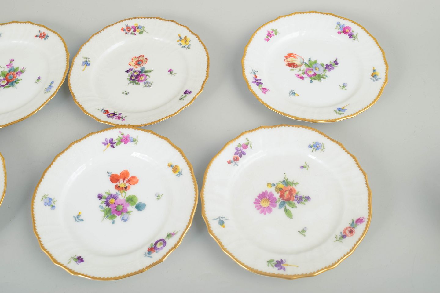 Royal Copenhagen, Saxon Flower, set of 8 cake plates.Set of eight cake plates in white-glazed porcelain with hand-painted floral decoration from the Saxon Flower series and a gilt rim; model 4/1627.