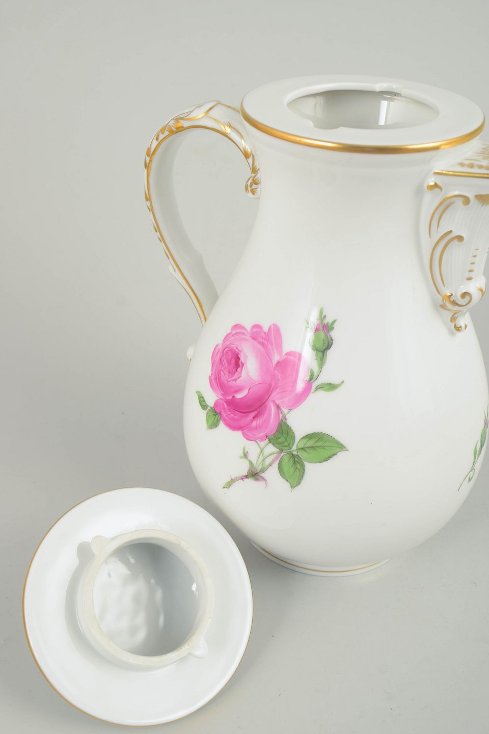 Meissen, coffee pot with lid, Pink flower series.Coffee pot in white porcelain with hand-painted polychrome pink flower decoration from the Pink flower series and gilt accents. Baluster-shaped body with curved handle and finial to the lid.