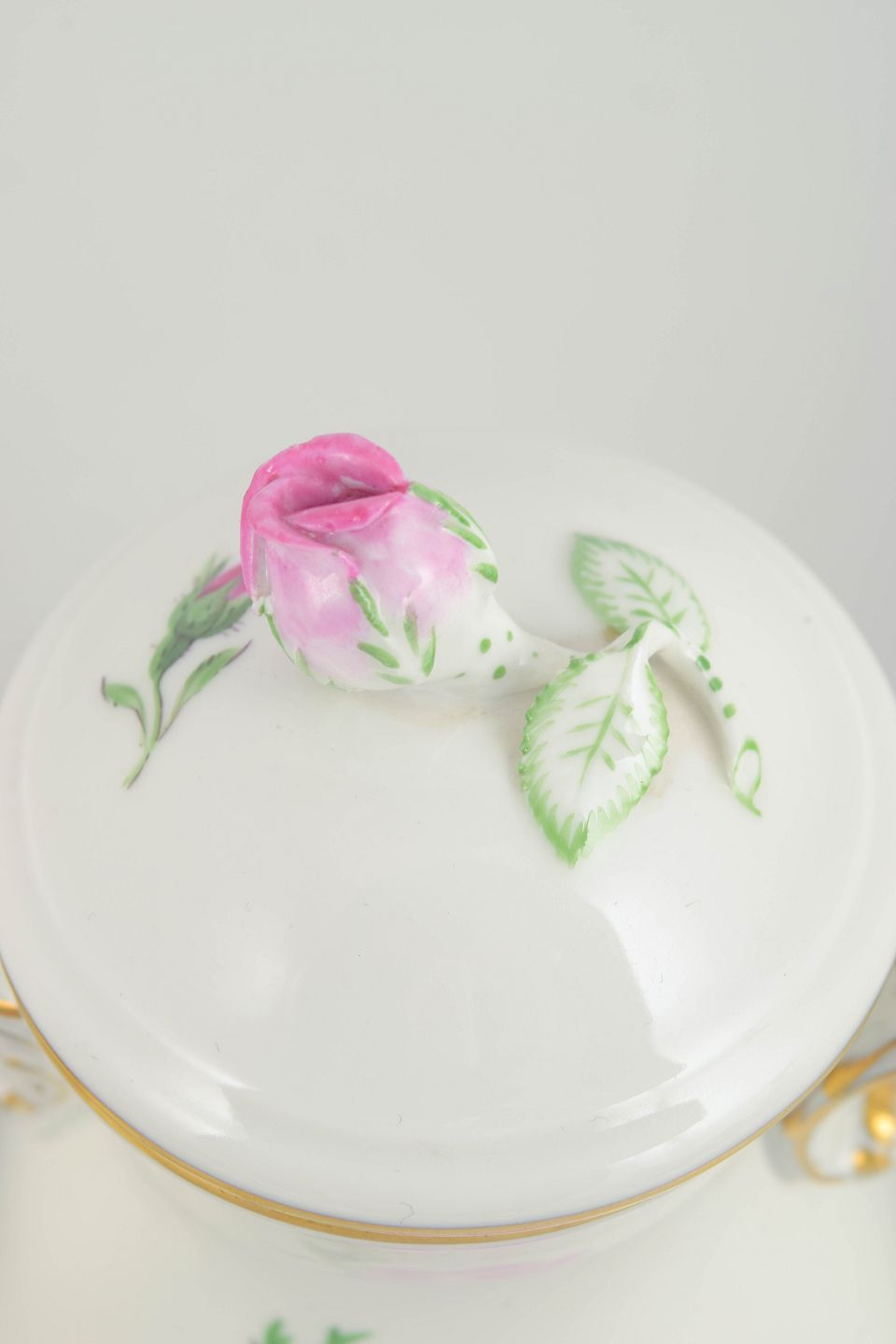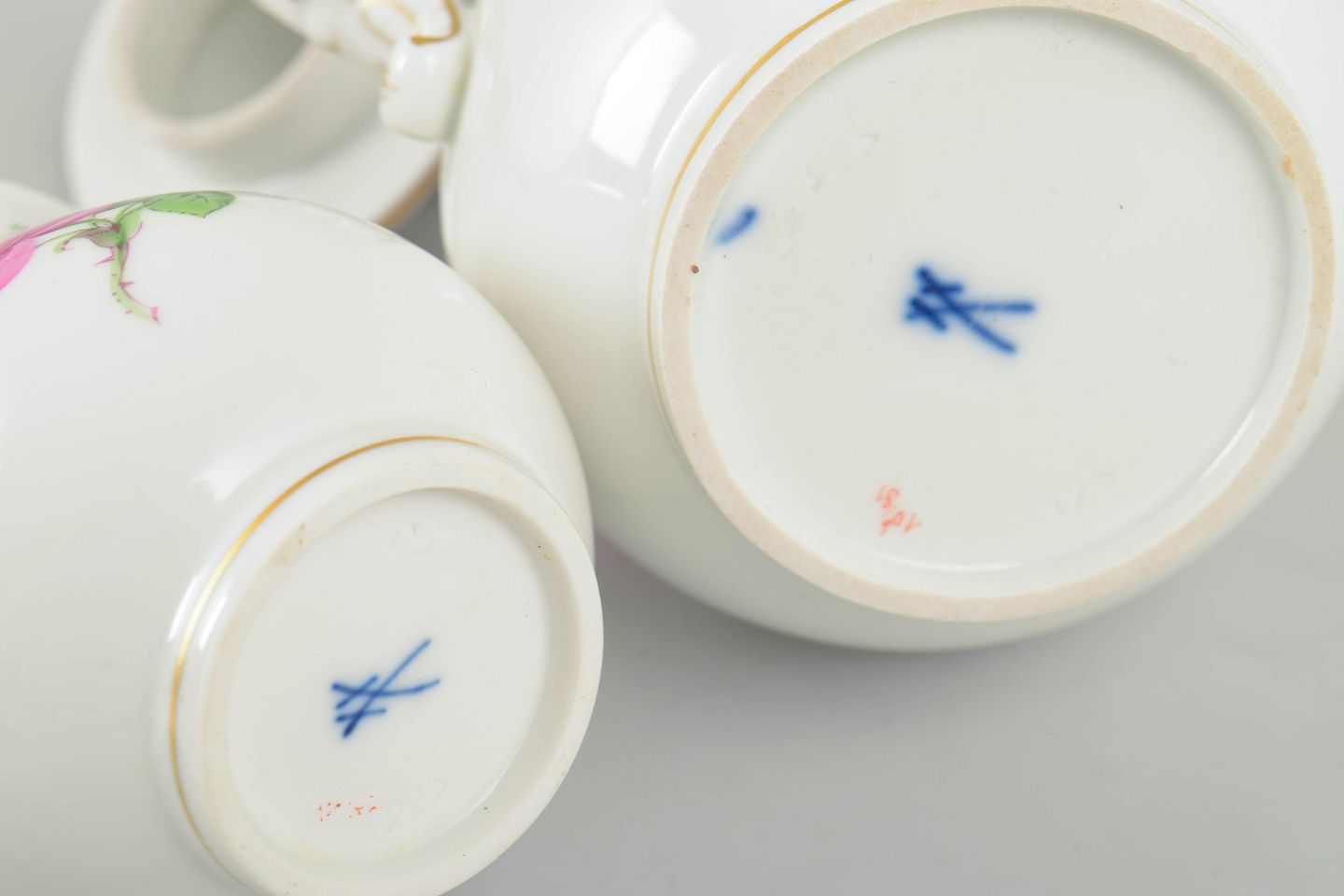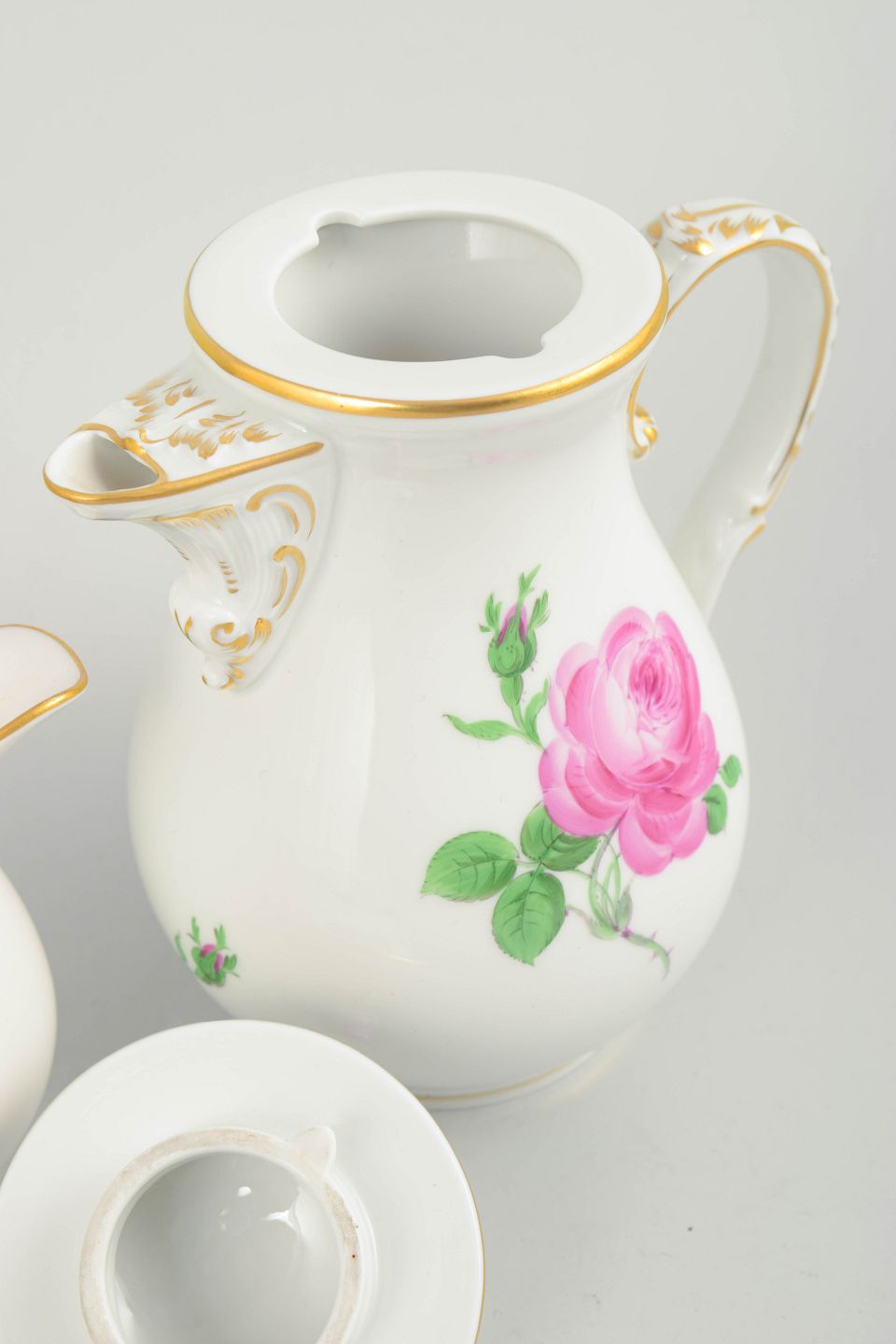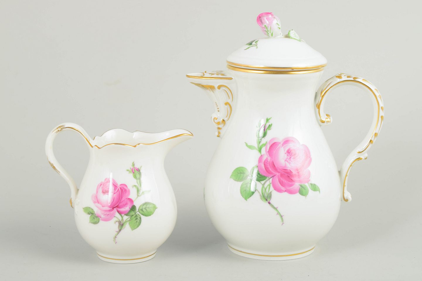Meissen, small "pink flower" coffee pot with matching lid and a creamer.Set comprising a small lidded coffee pot and matching creamer in white porcelain with hand-painted pink roses and gilt accents. Elegant baluster shapes with curved handles.