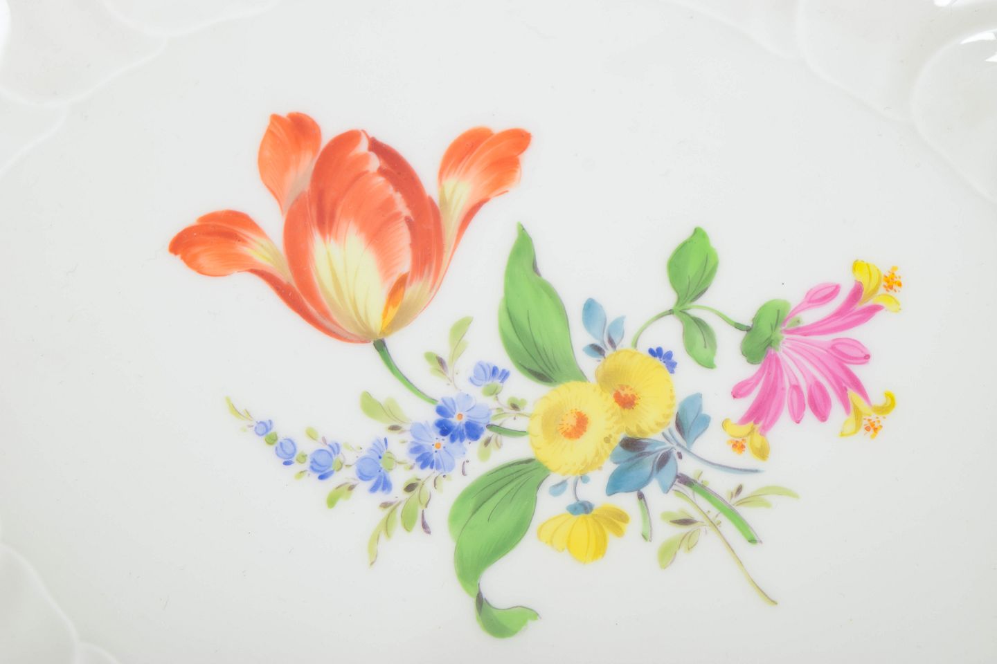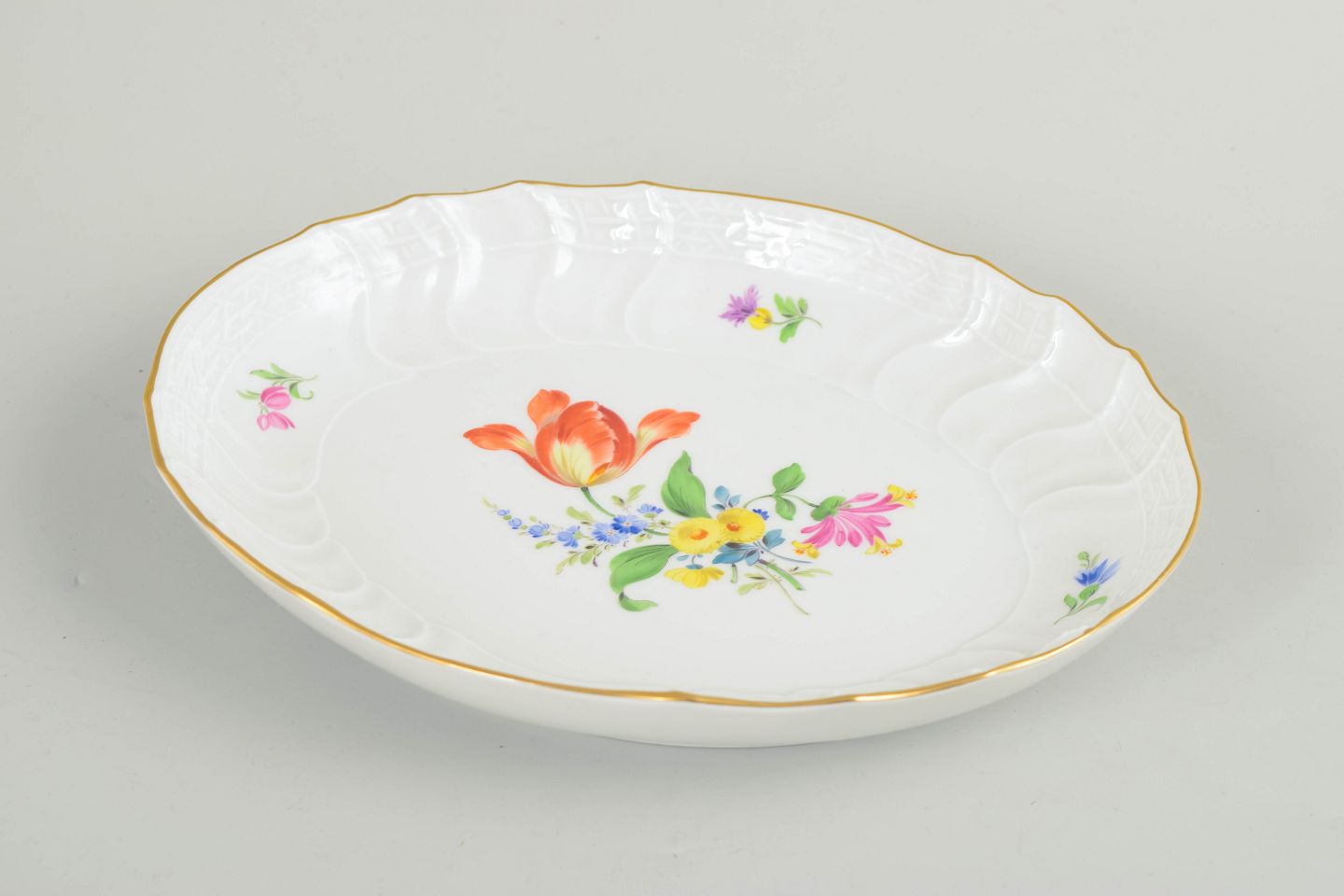 Decorative dish in white porcelain with moulded rim and gilded edge. Hand-painted with polychrome floral bouquets from the Saxon flower series.