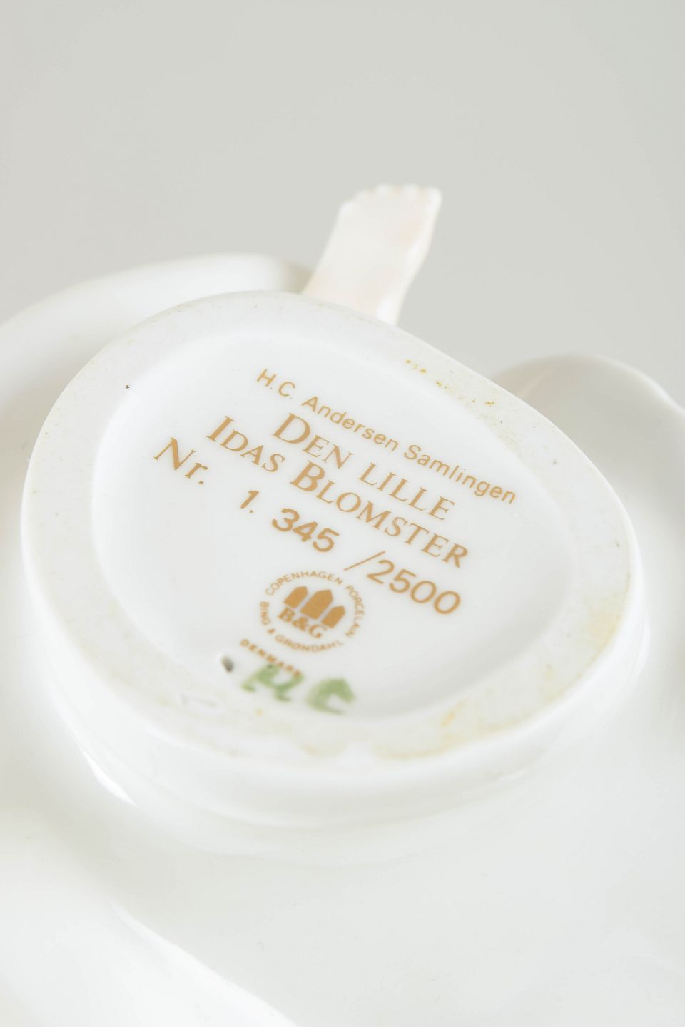 Bing & Grøndahl, Little Ida’s Flowers figurine.Porcelain figurine depicting Little Ida’s Flowers, produced for the H.C. Andersen Collection. The figure shows a young girl with raised arms and a flowing dress in soft white and pink tones with subtle green accents. The underside is marked Little Ida’s Flowers, No. 1345/2500, indicating a limited edition.