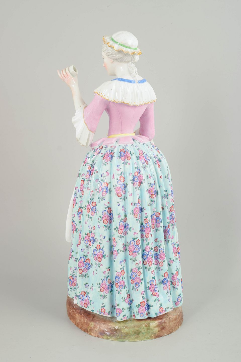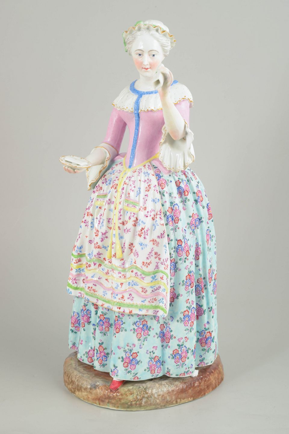 Meissen, La Belle Chocolatière, figurine. Museum qualityLarge Meissen porcelain figure made after Jean-Étienne Liotard’s celebrated subject “La Belle Chocolatière” (1744). The figure depicts a woman in 18th-century dress holding a serving tray and cup, richly decorated with polychrome floral painting, finely rendered facial features, and carefully applied details. Executed after model no. 1471 and bearing the Marcolini mark, dated to approximately the 1790s.