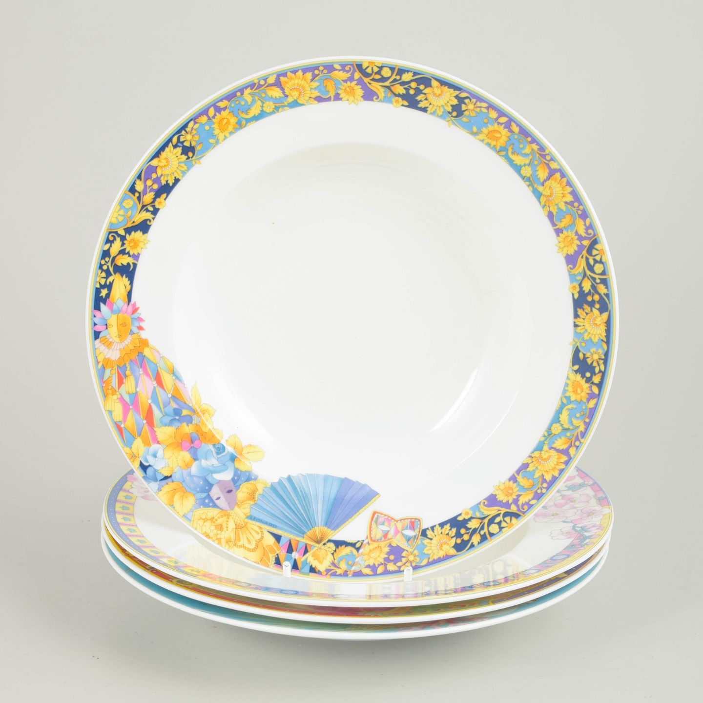 Hutschenreuther, set of 4 deep plates.Elegant bone china set with a colourful decorative pattern; the Leonard Paris model is noted in the description. Classic deep forms with a wide rim and detailed decoration along the border.