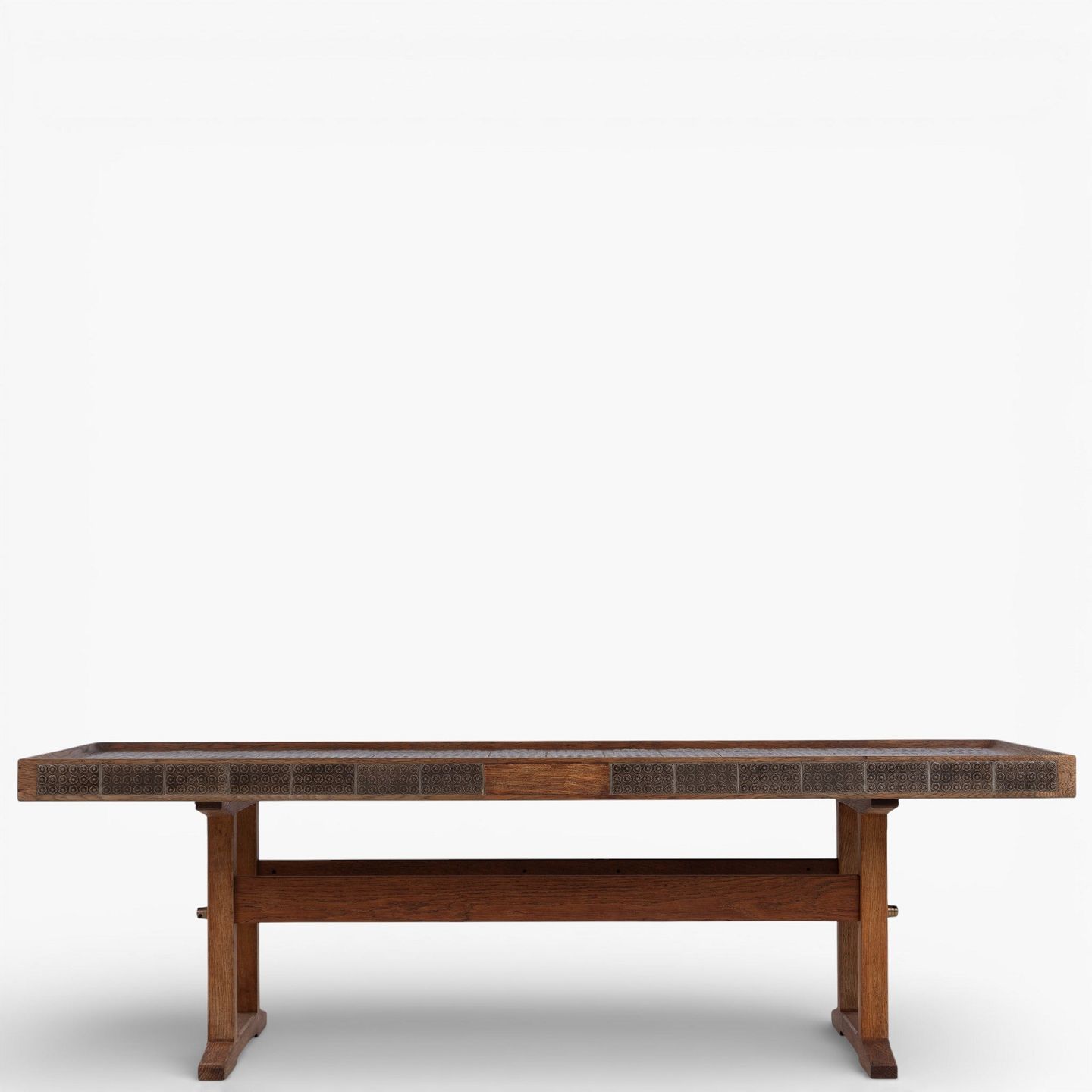 Coffee table in patinated oak decorated with brown tiles. Stamped by manufacturer.