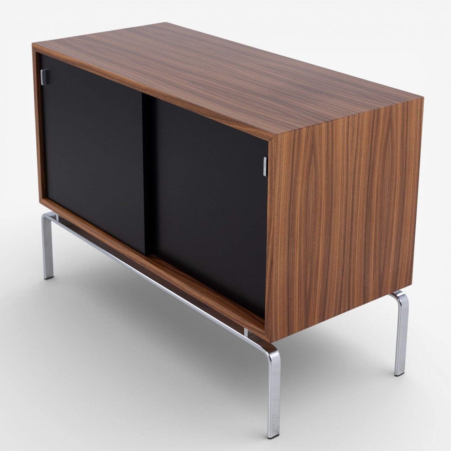 FK 100 - Sideboard in rosewood with black lacquered sliding doors and steel frame.