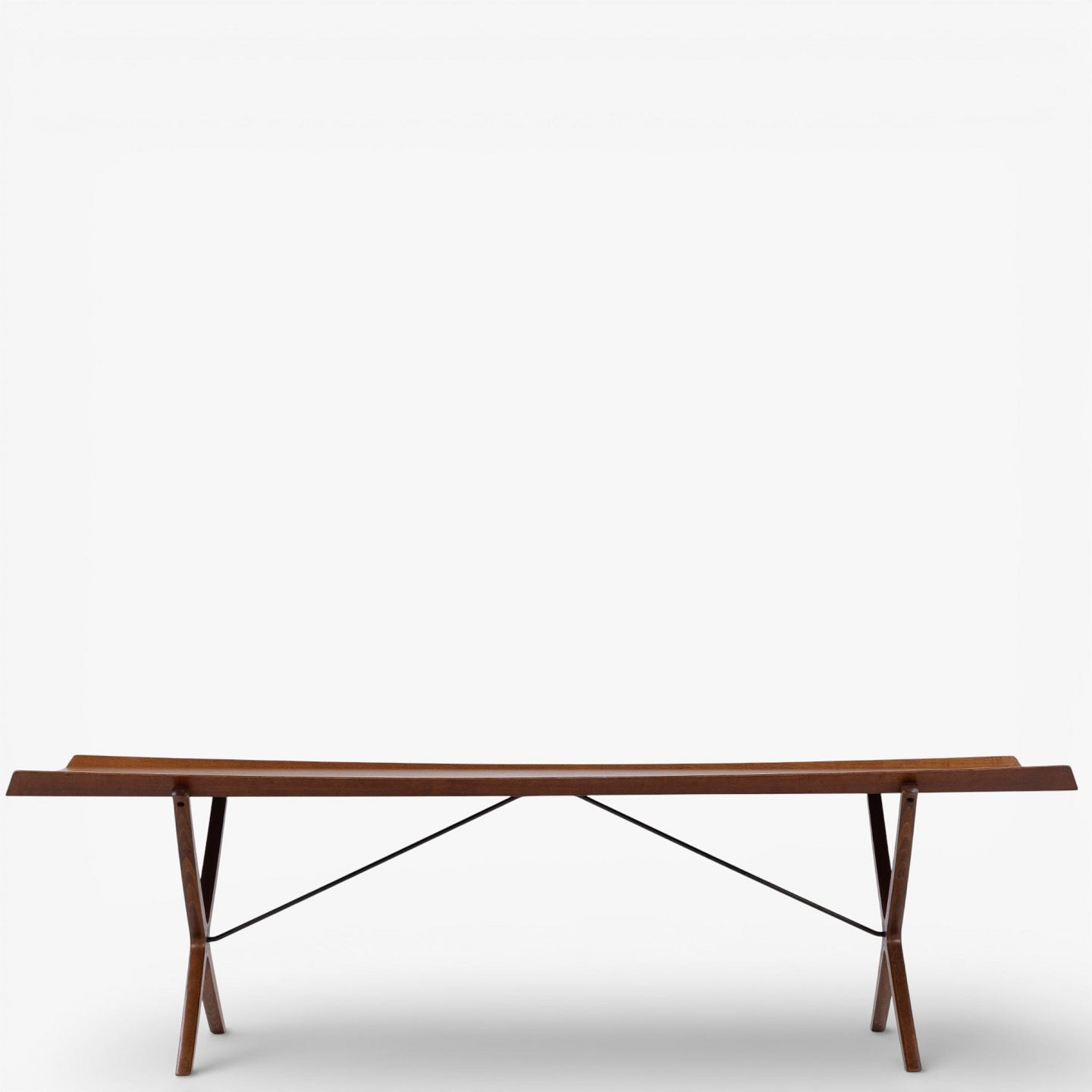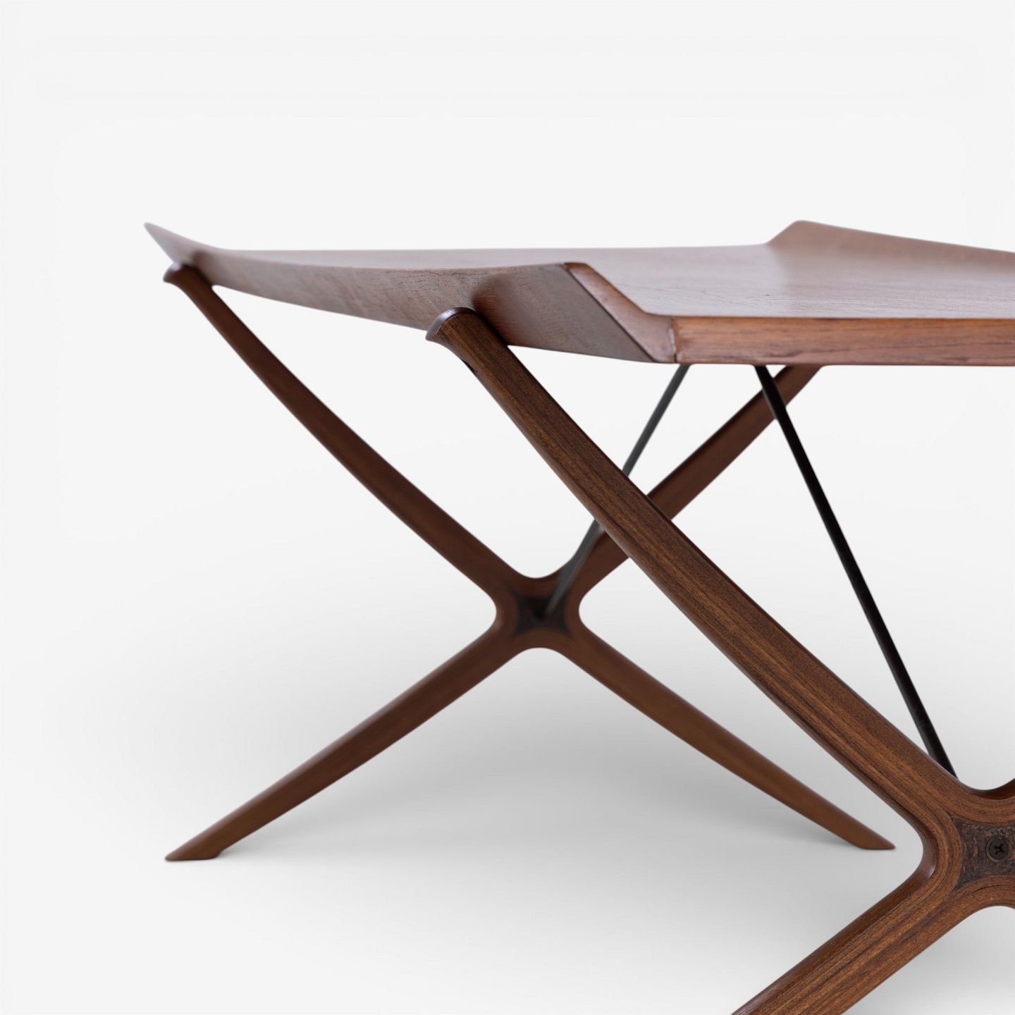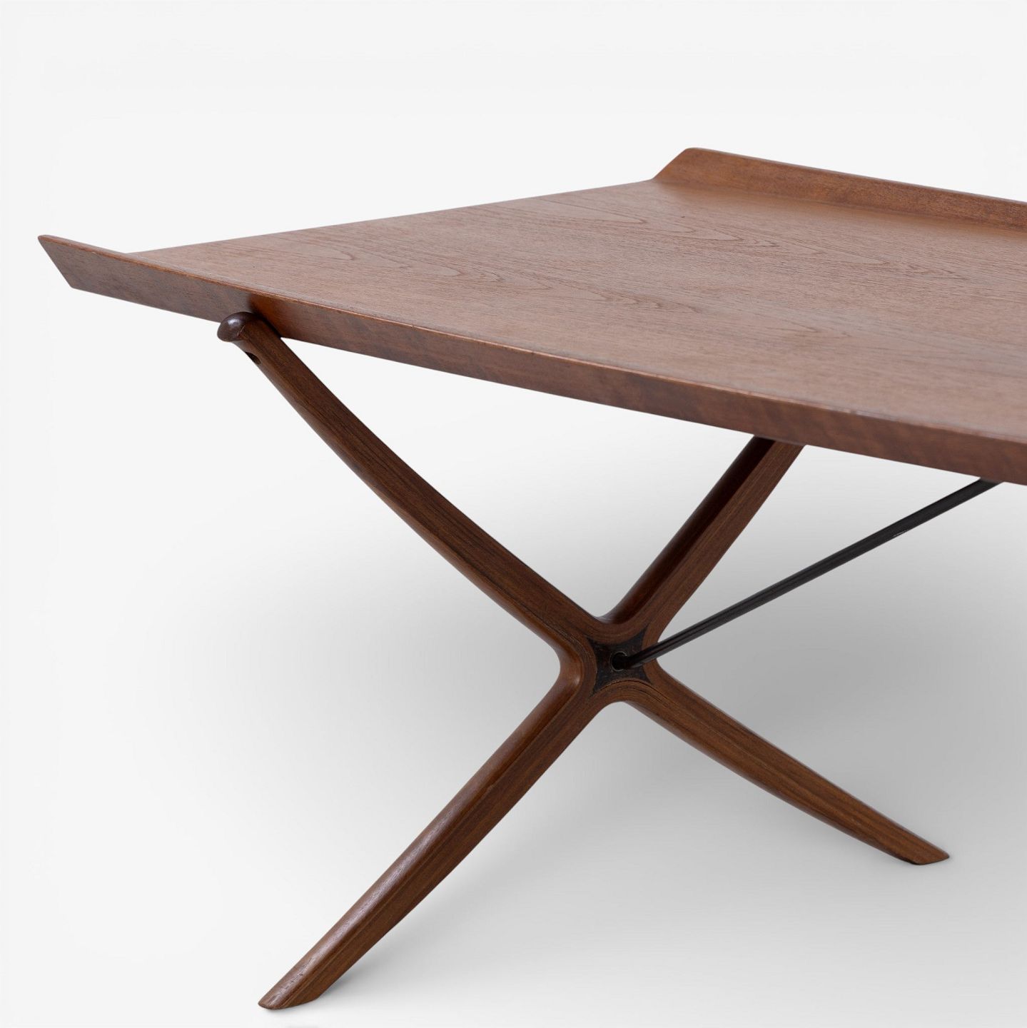 Rare 'X' coffee table with patinated teak top with fluted edge on cross frame. Manufacturer's stamp.