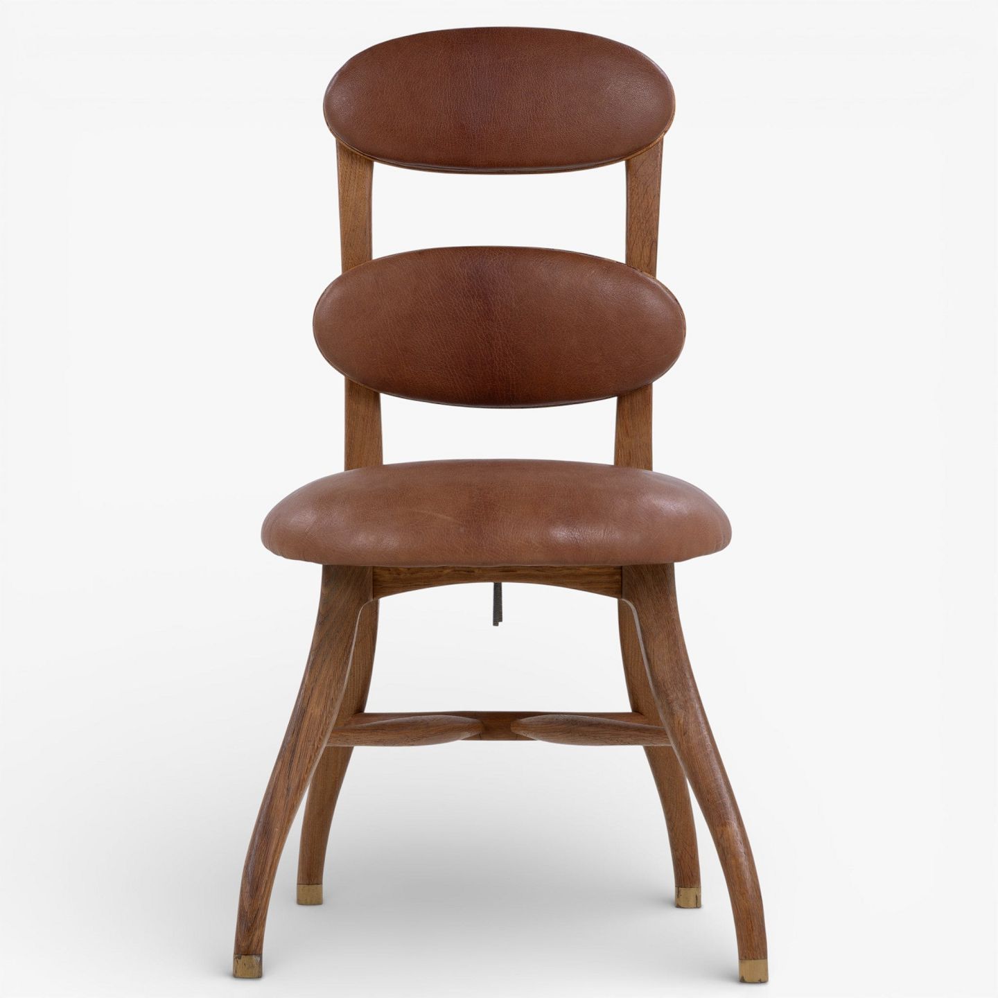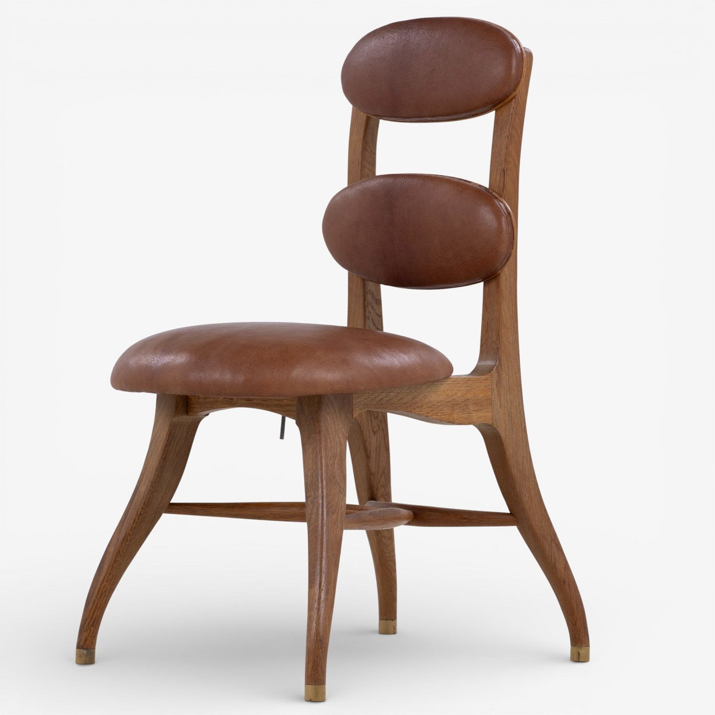 'Musician's chair' with a frame in patinated oak and an adjustable seat and back in patinated nigerian leather. Designed in 1942.