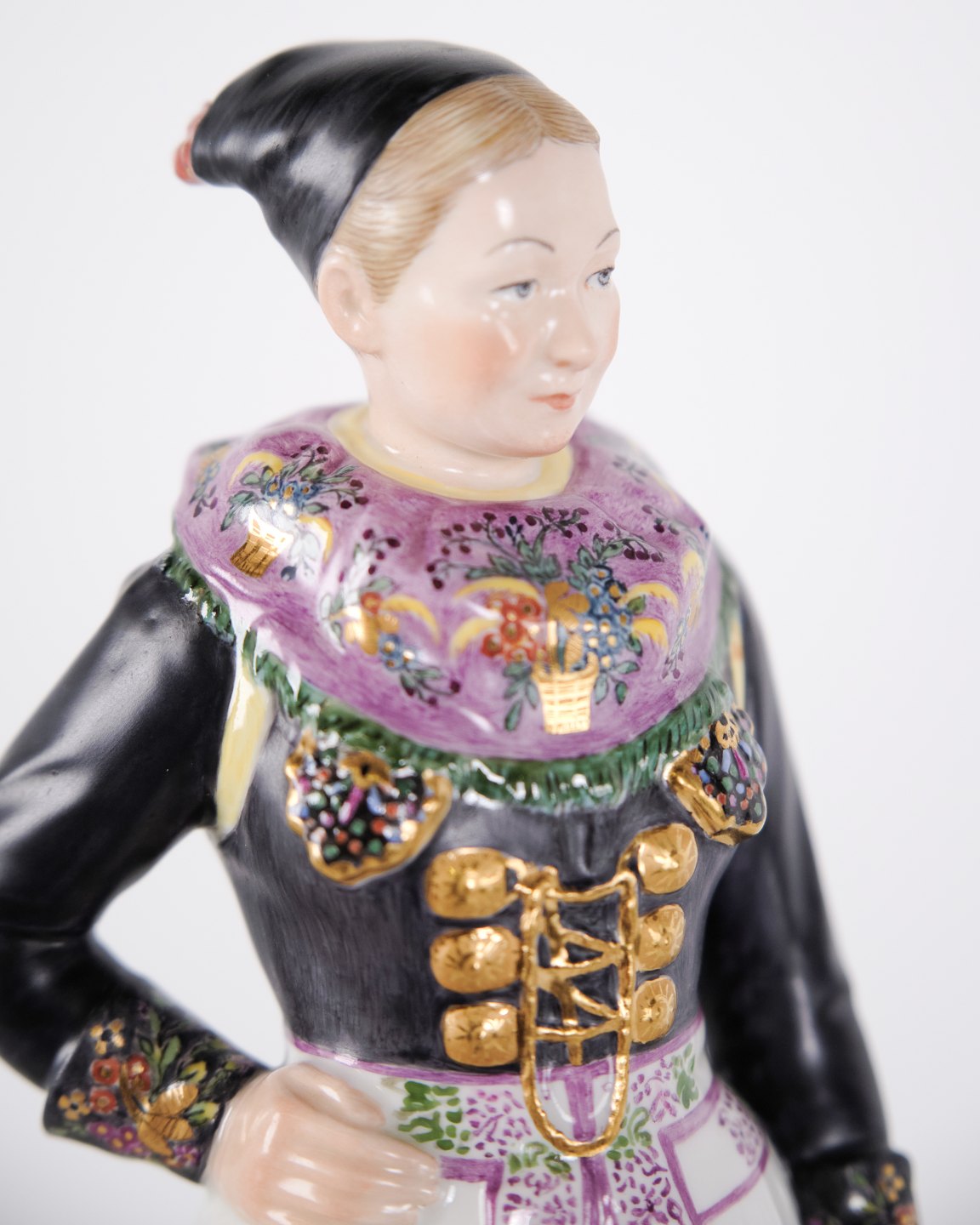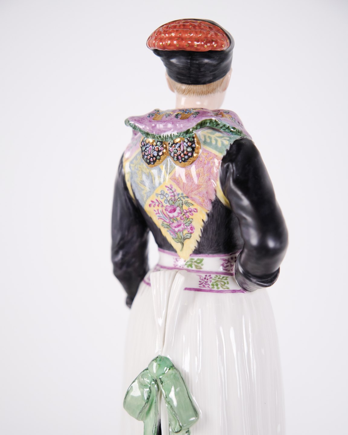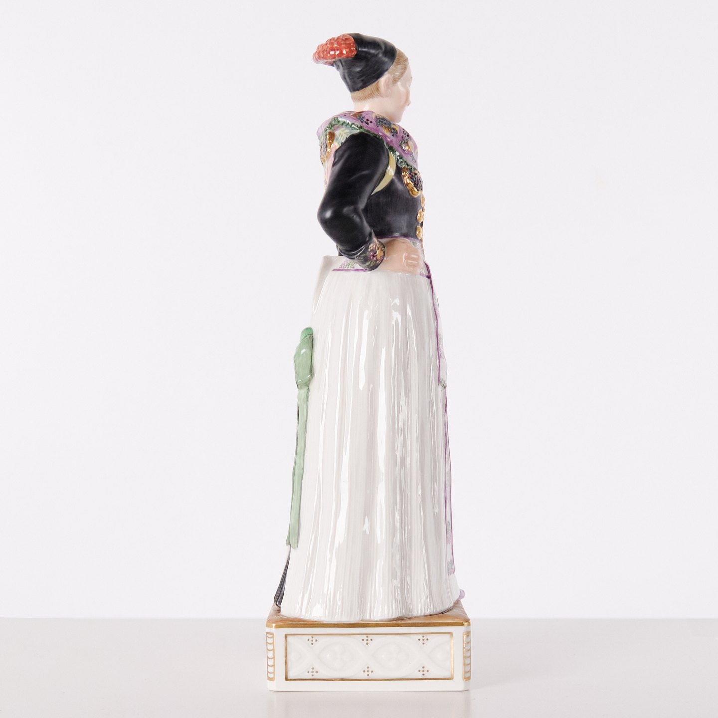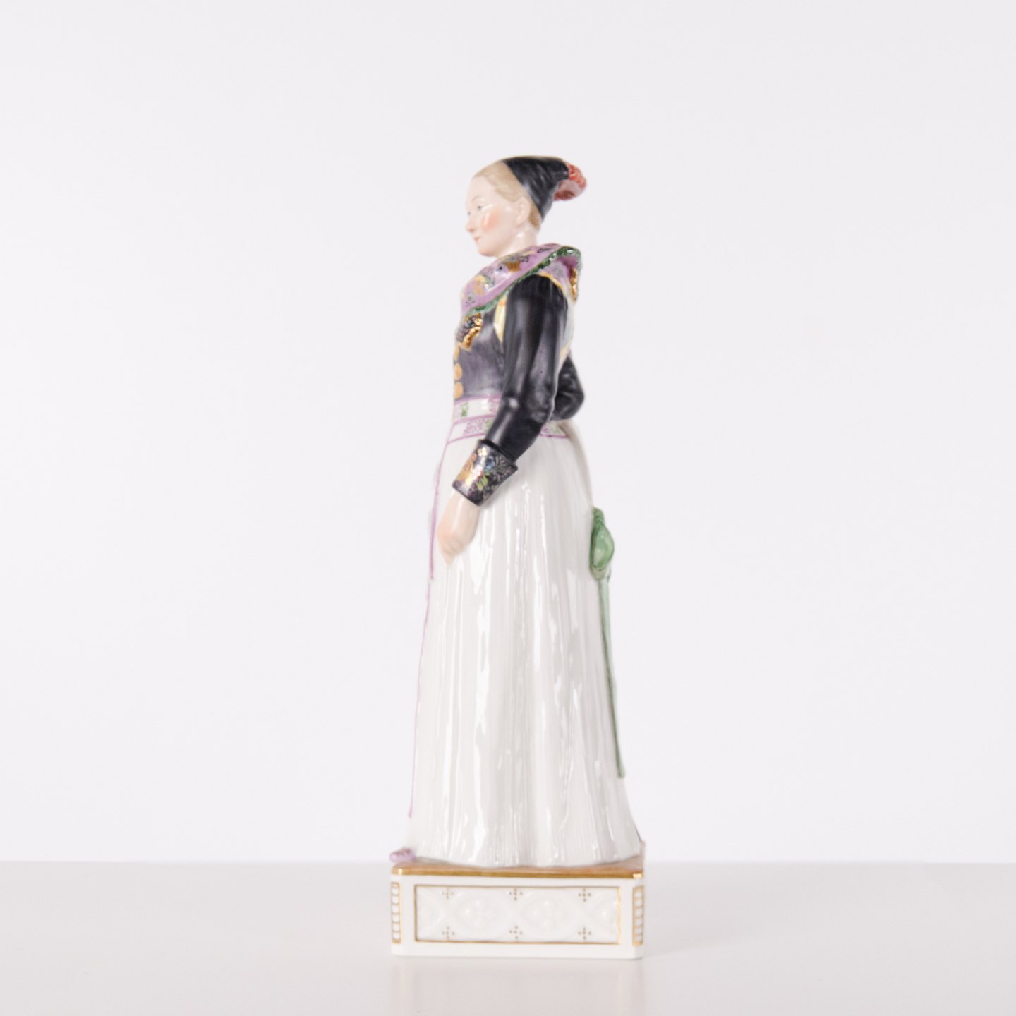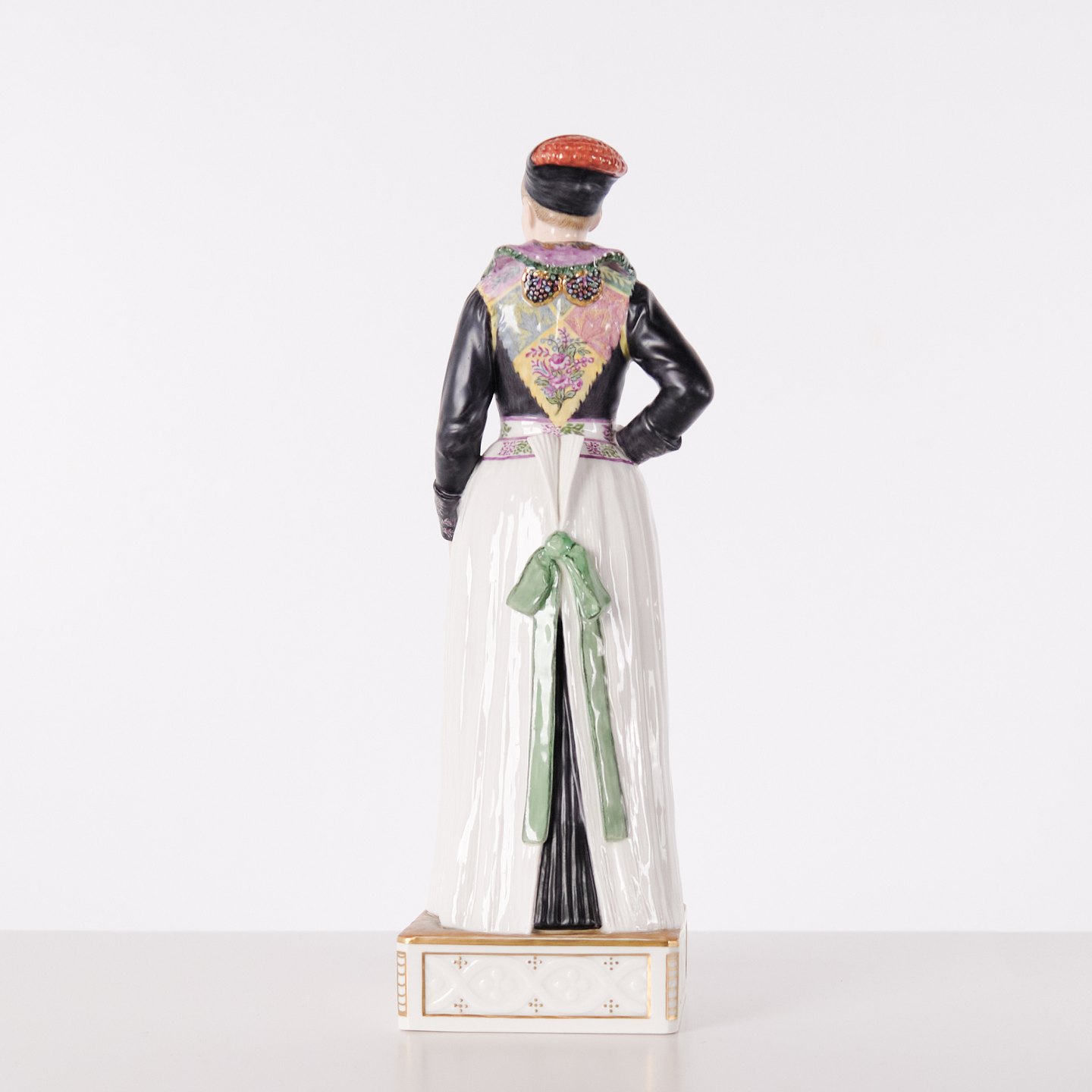 Overglaze porcelain figurine in Danish national dress, model 12104, depicting a cook’s costume from Amager. Designed by Carl Martin-Hansen (1877–1941) for Royal Copenhagen and part of the Danish National Costumes series.The series comprises a total of 47 figures and was produced between 1906 and 1925. Carl Martin-Hansen was recognised for his work with figures, busts and public monuments and belonged to the naturalistic tradition in Danish art around the turn of the century. The Danish national costume series is regarded as one of his most significant works for Royal Copenhagen and is known for its detailed and accurate representation of regional dress.