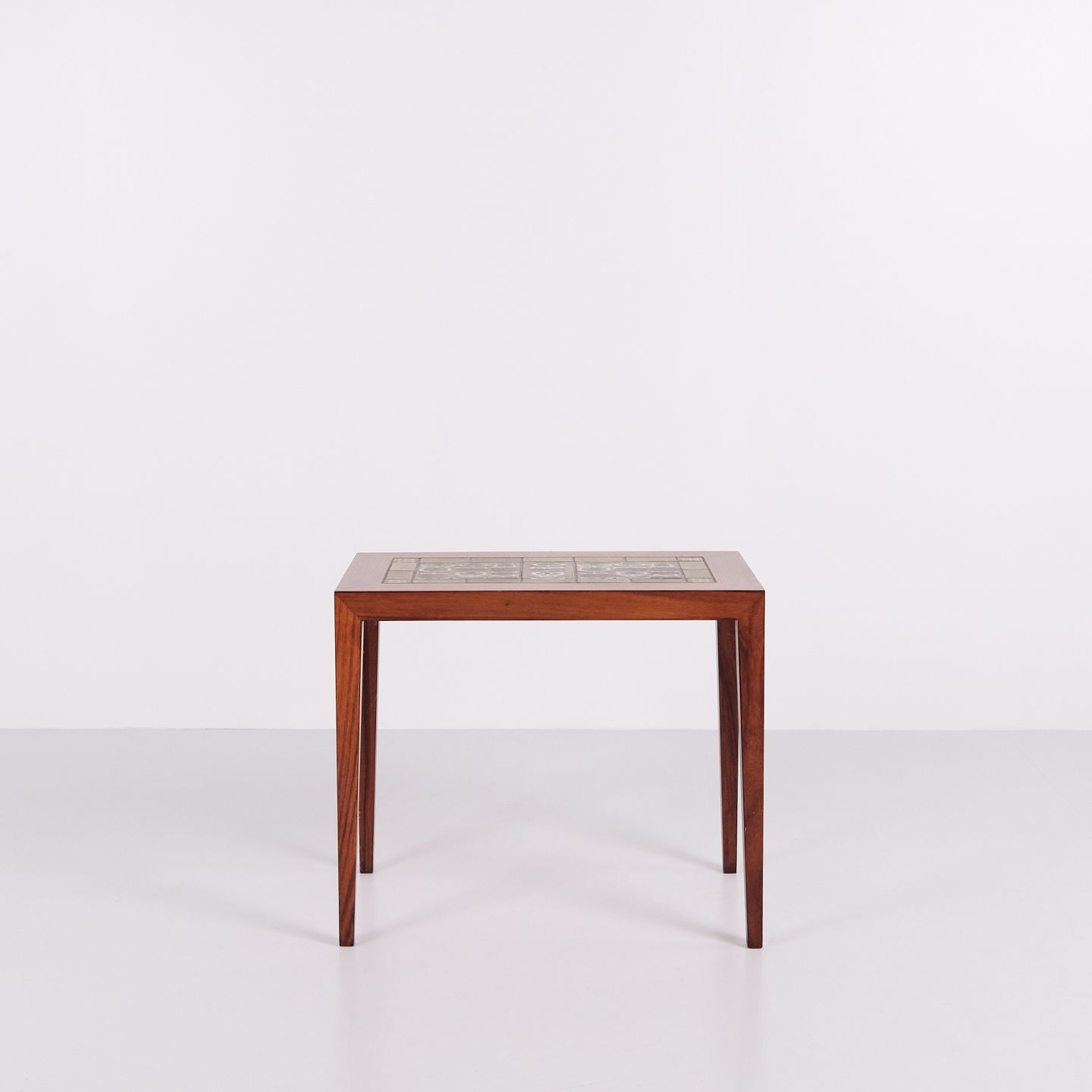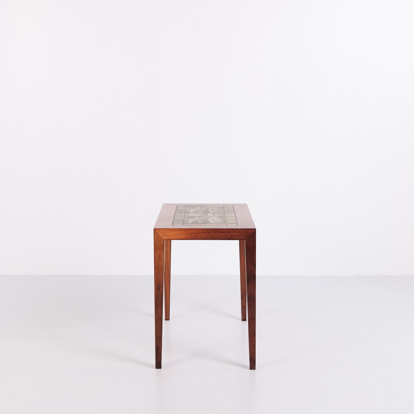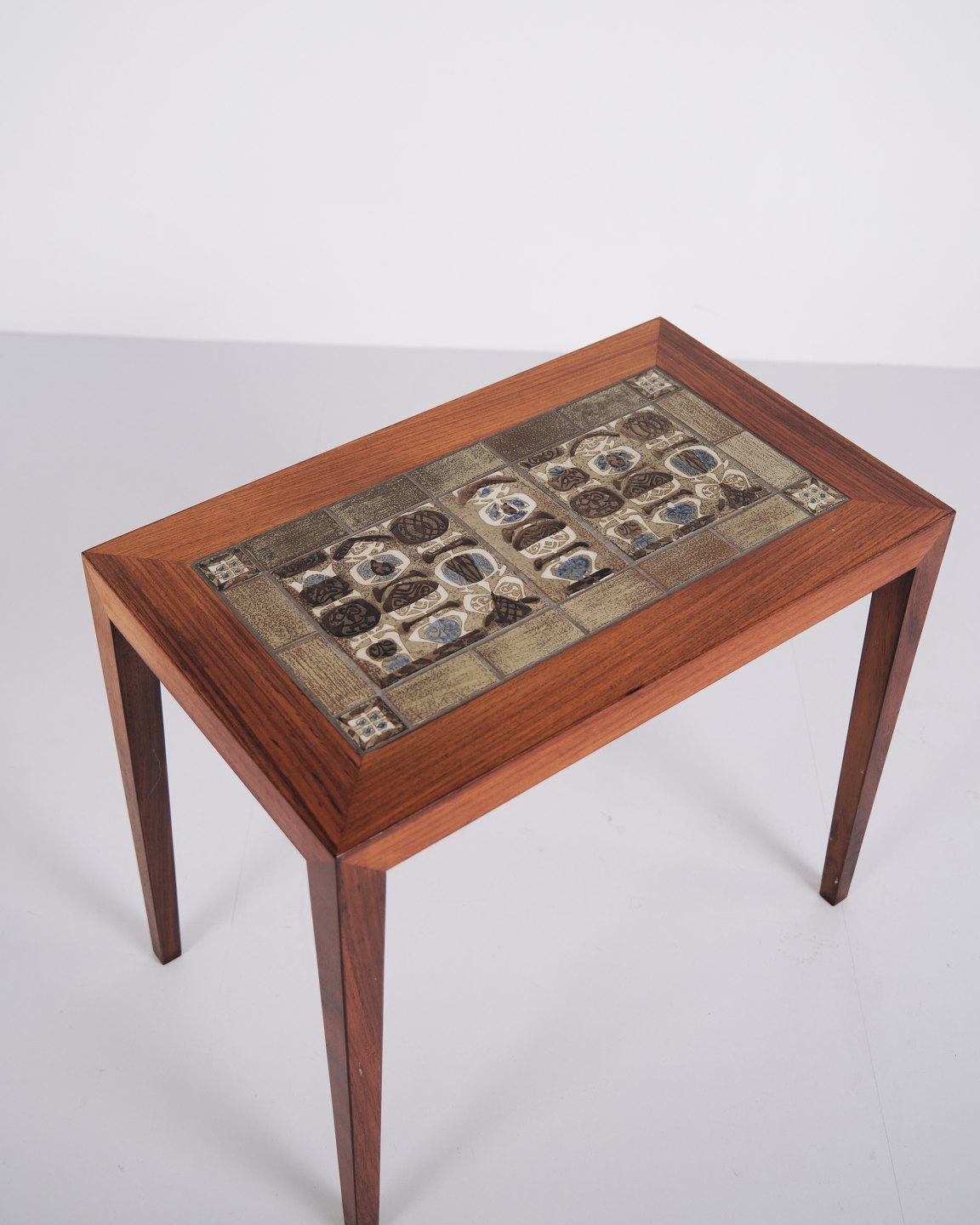 Side table, model 163, designed by Severin Hansen and produced by Haslev Møbelsnedkeri. The table is made of wood and features inset green faience tiles designed by Nils Thorsson for Royal Copenhagen. The combination of cabinetmaking and ceramic tiles is characteristic of Danish furniture from the 1960s.