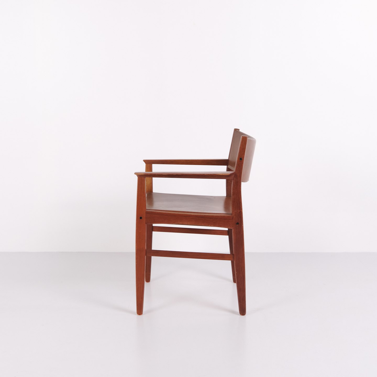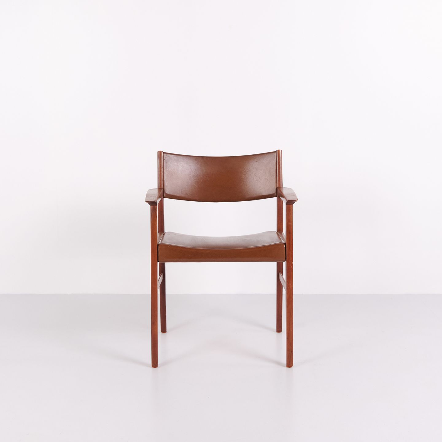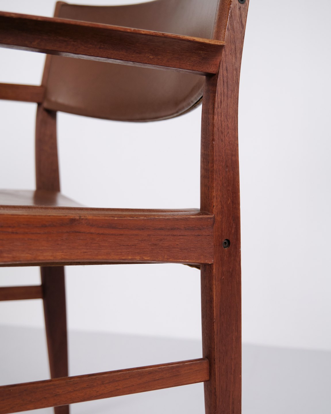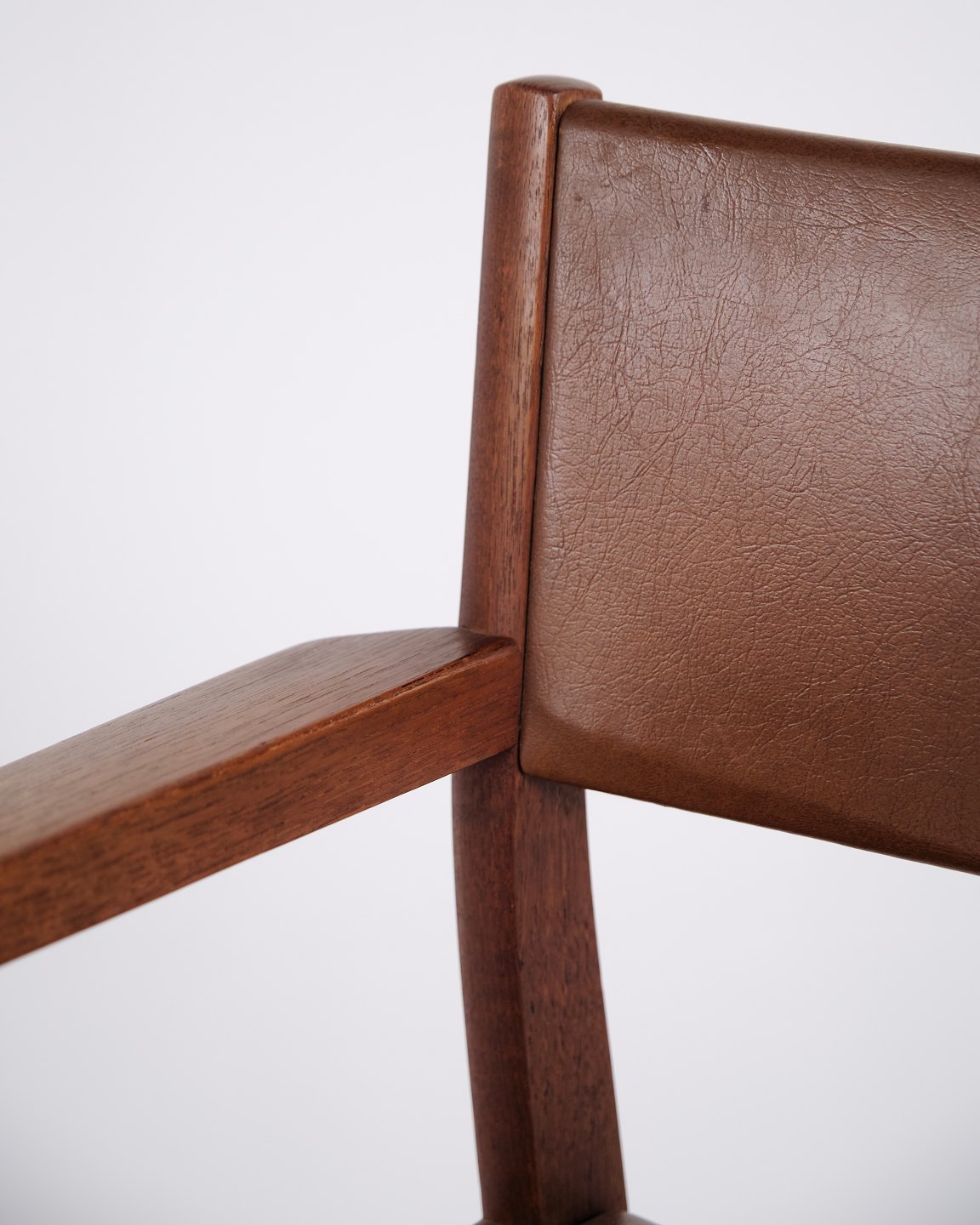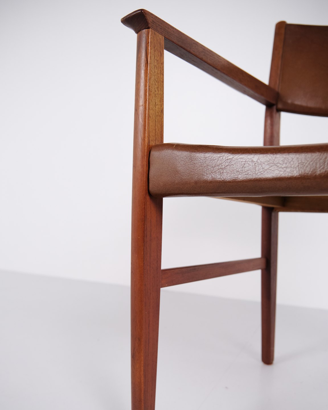 Armchair made of teak with seat and back upholstered in brown leather. The chair is representative of Danish furniture design from the 1960s, characterised by solid materials and functional construction. Suitable for use as a dining chair, desk chair or freestanding armchair.— Origin: Denmark