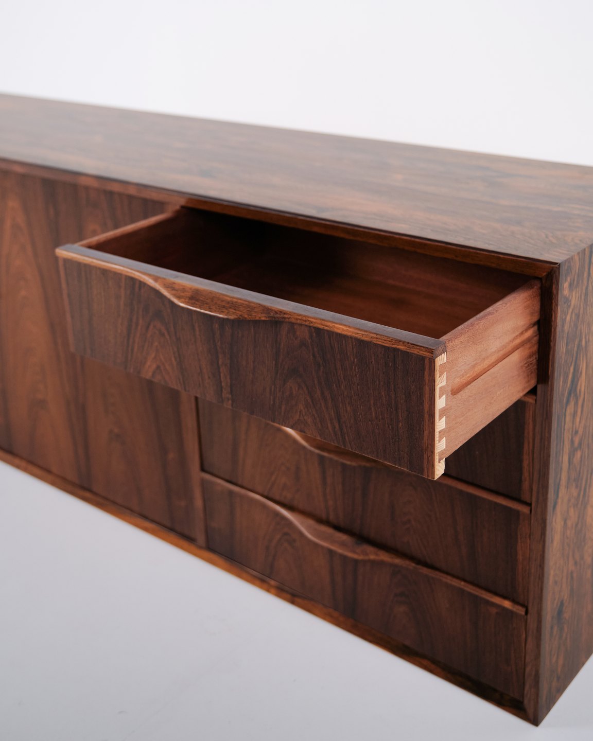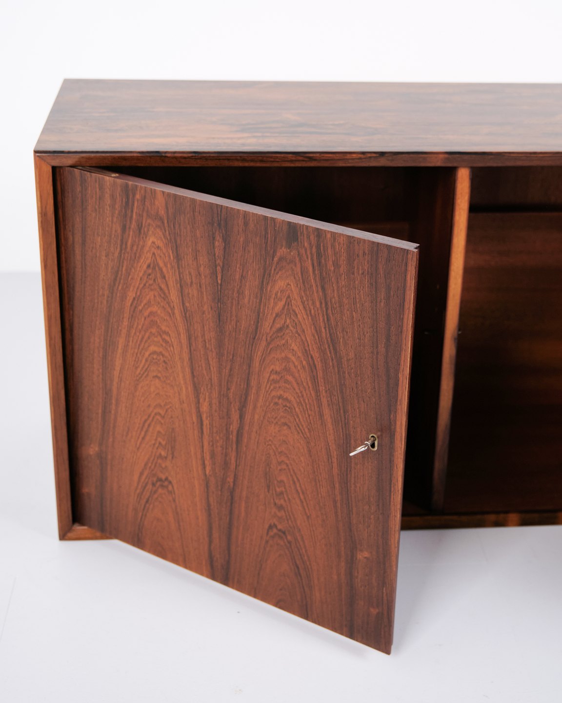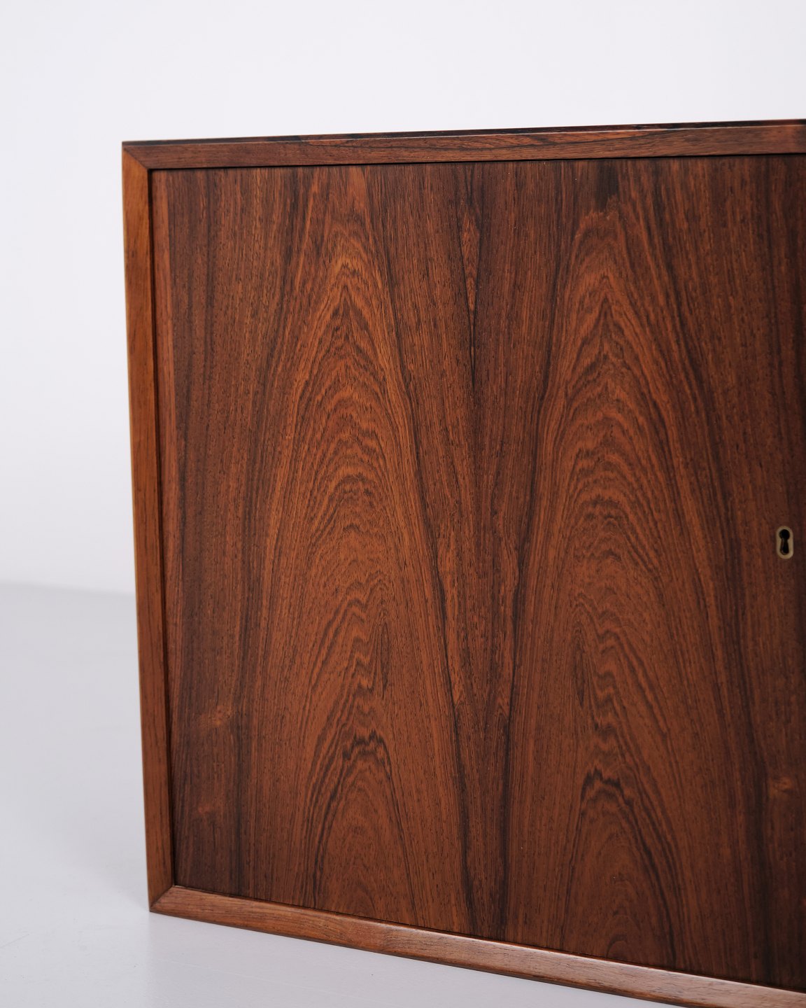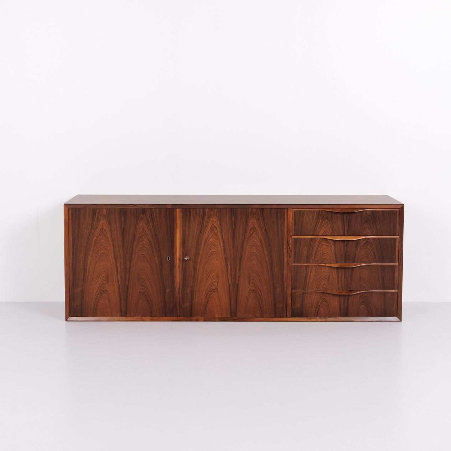 Wall-mounted sideboard executed in rosewood, designed by Erling Torvits and produced by Klim Møbelfabrik in the 1950s. The wall-mounted construction reflects functional Danish furniture design of the period and allows for a light, space-saving presentation. The use of rosewood highlights the focus on material quality and cabinetmaking.— Designer: Erling Torvits