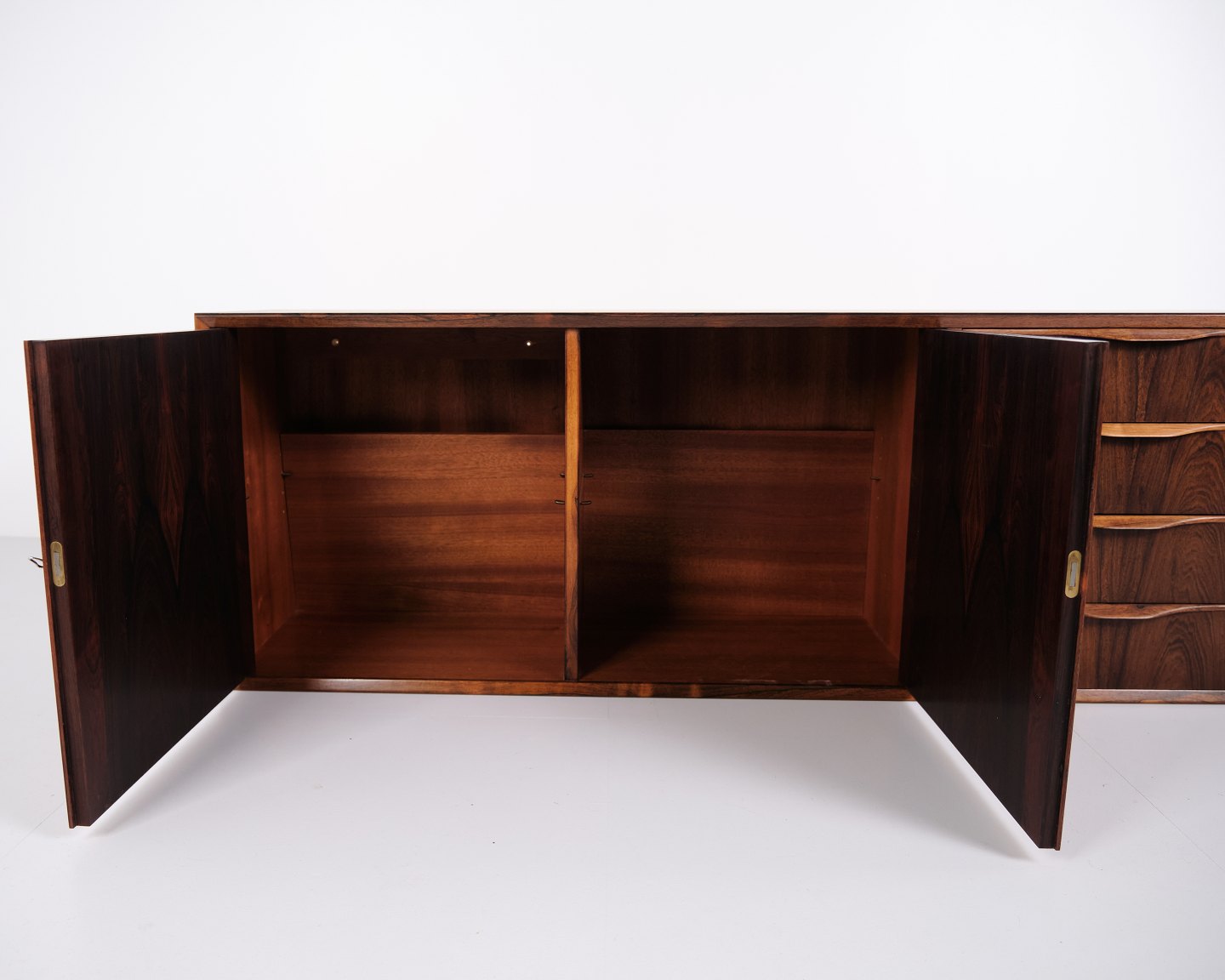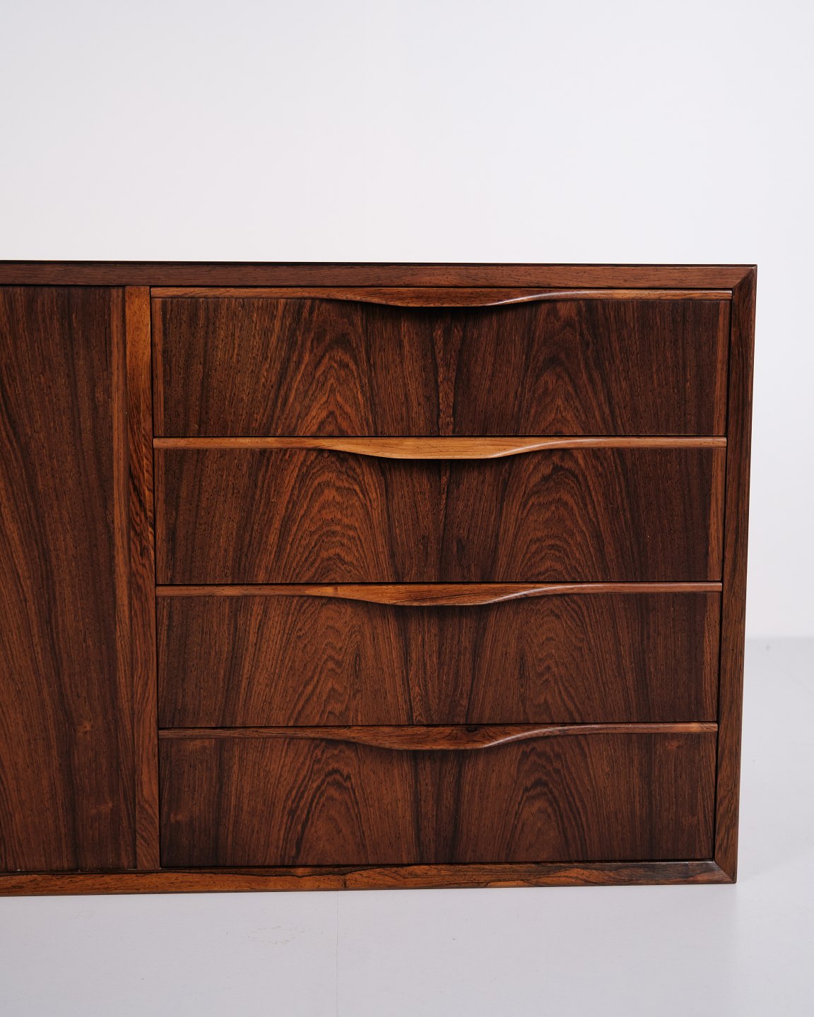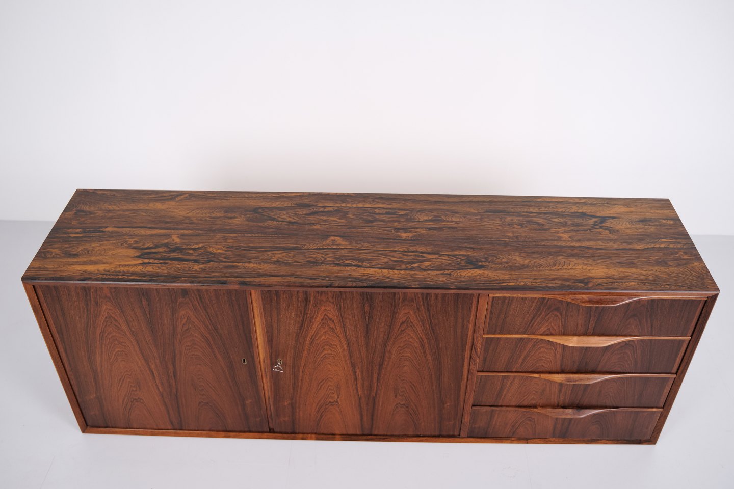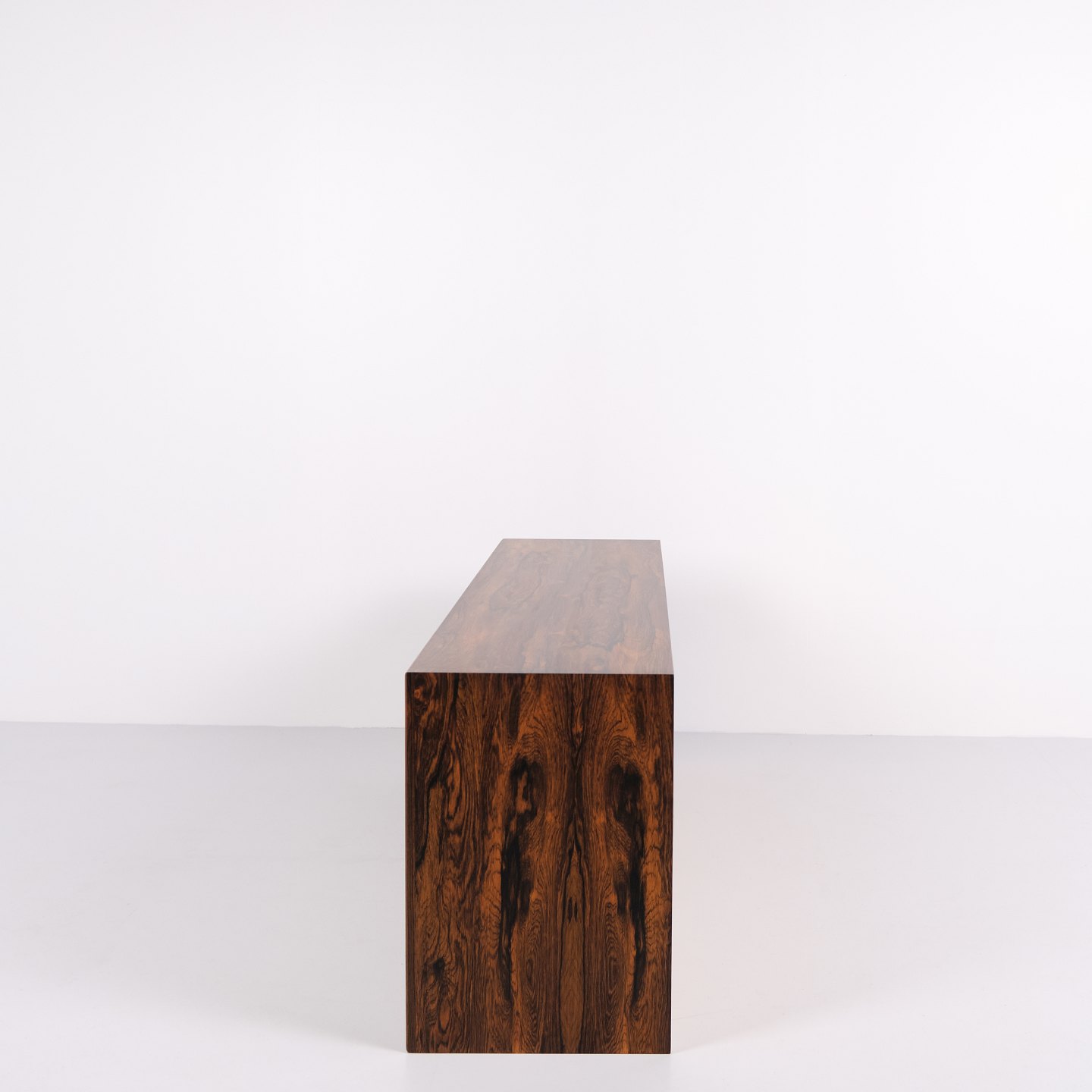 Wall-mounted sideboard executed in rosewood, designed by Erling Torvits and produced by Klim Møbelfabrik in the 1950s. The wall-mounted construction reflects functional Danish furniture design of the period and allows for a light, space-saving presentation. The use of rosewood highlights the focus on material quality and cabinetmaking.— Designer: Erling Torvits
