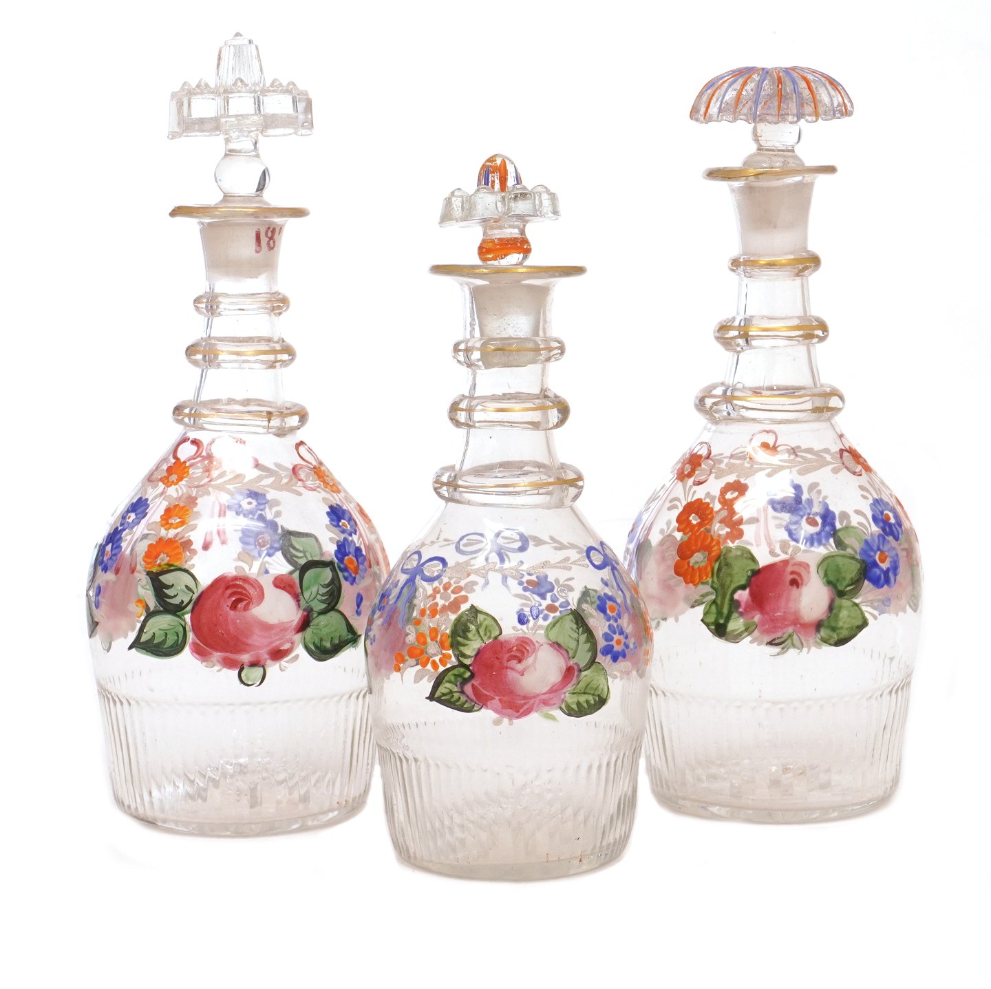 Set of three enamel decorated carafes circa 1860-80H: 19-23cm