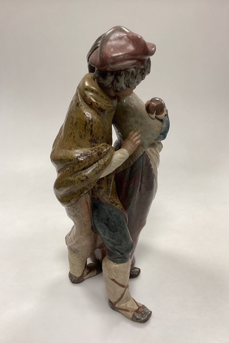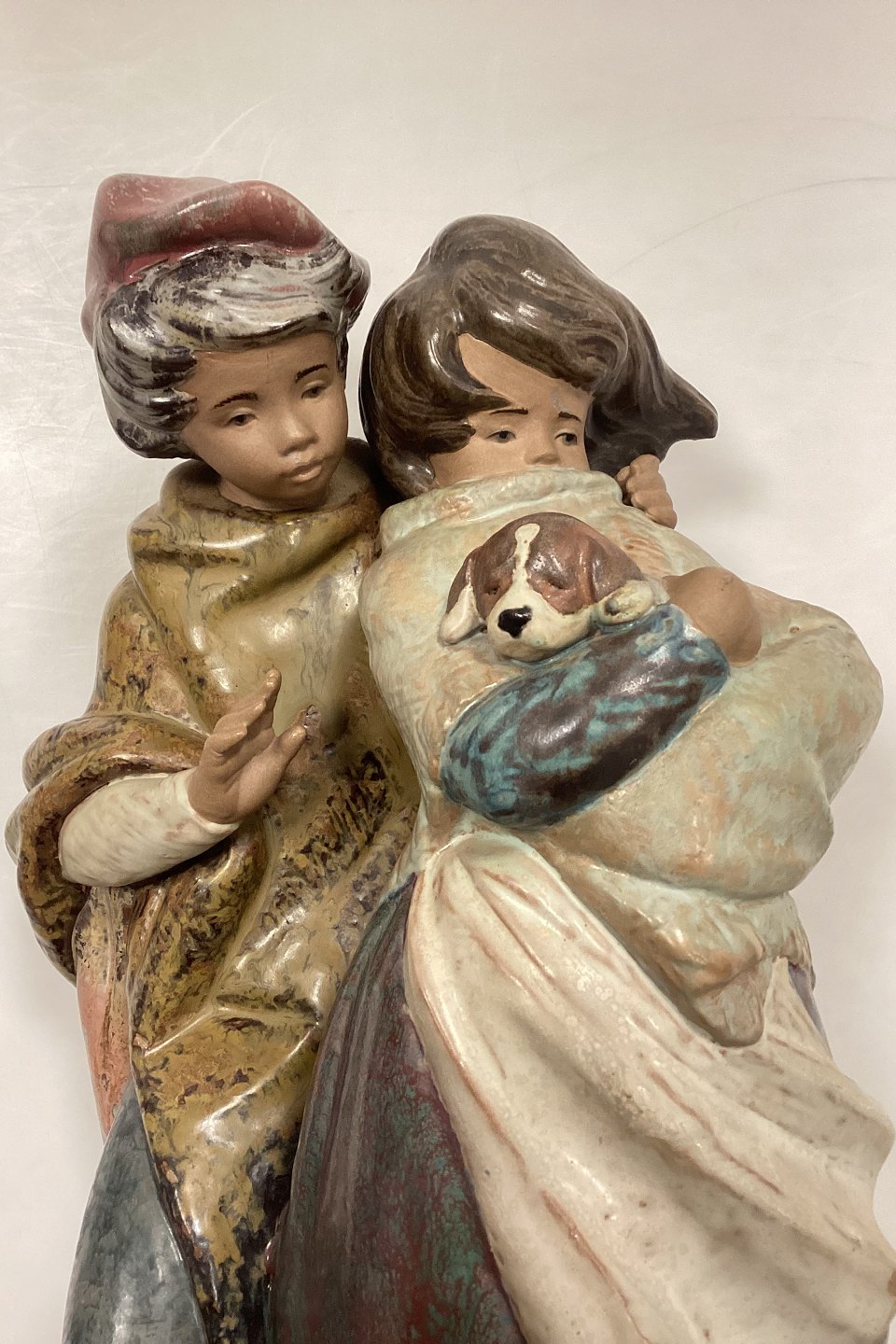 Lladro Stoneware Figurine of Girl and Boy with Dog - Facing the Wind. Designed by Juan Huerta, Spain.Measures 36 cm / 14.17 in.