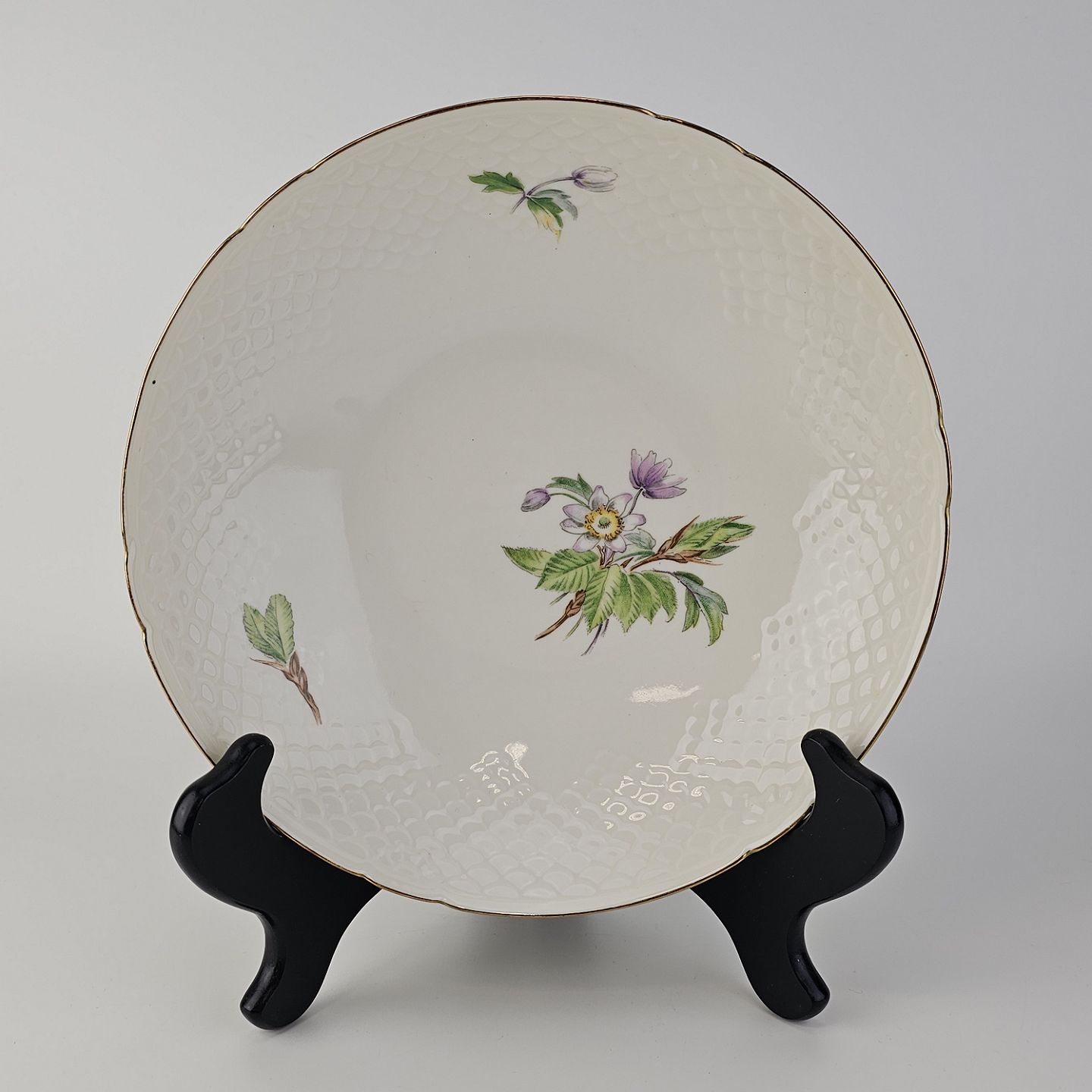 Frigga Anemone er cremefarvet porcelæn dekoreret med motiv af anemoner og bøgeløv med guldkant