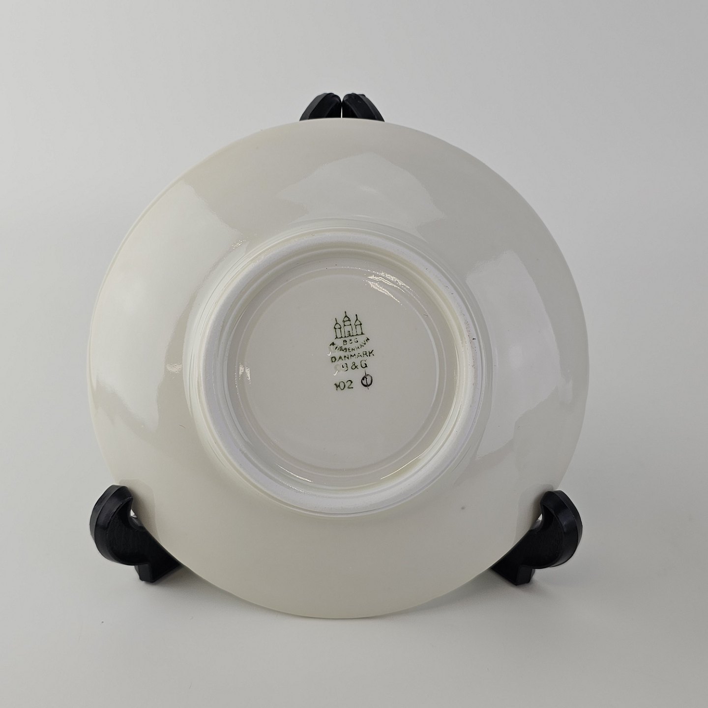 Frigga Anemone er cremefarvet porcelæn dekoreret med motiv af anemoner og bøgeløv med guldkant