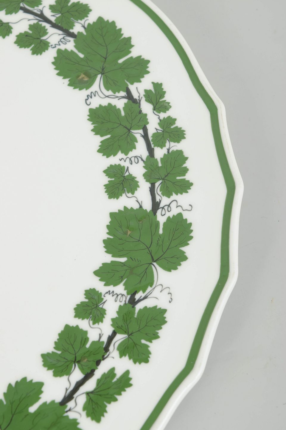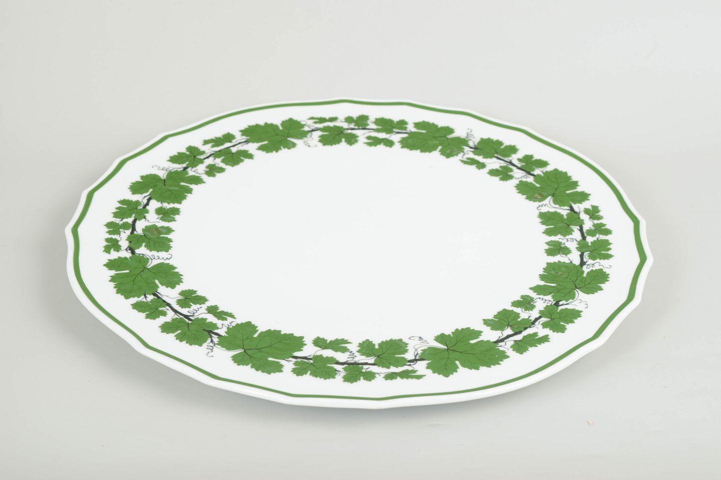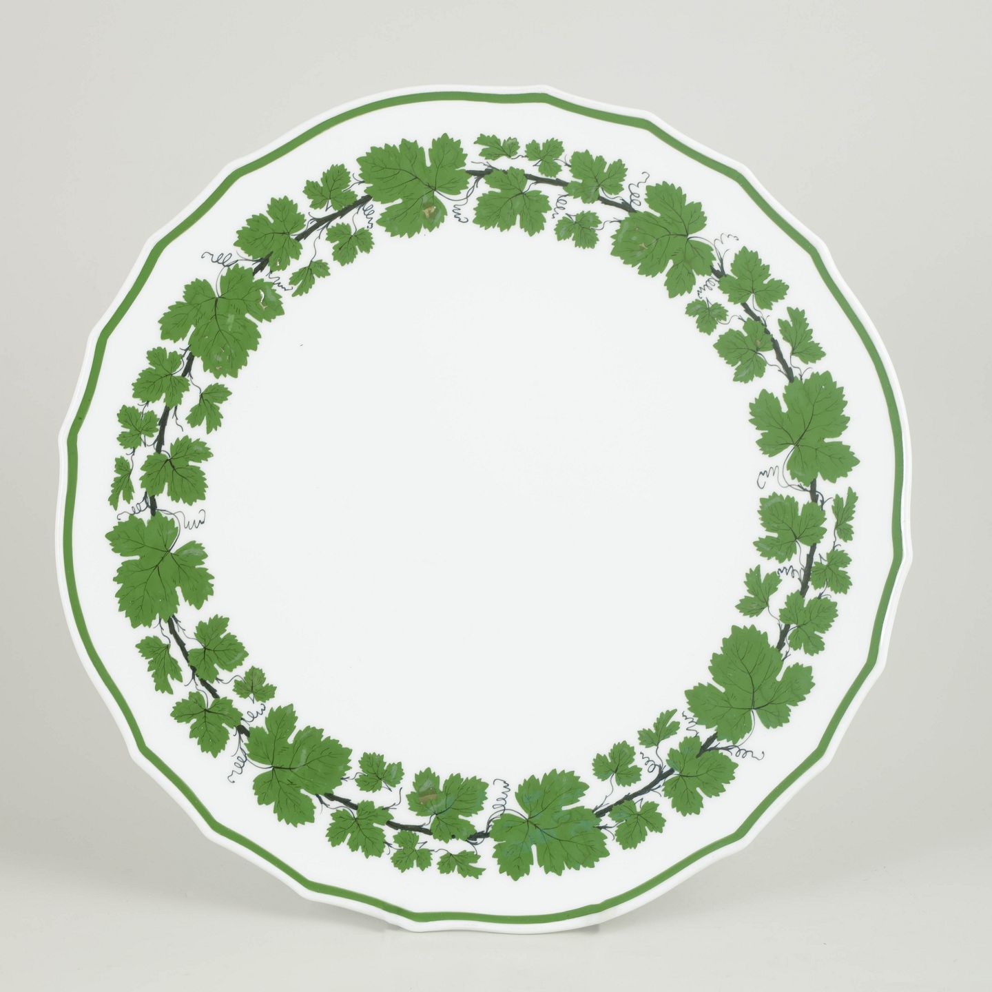 Large round porcelain cake dish with a green vine and vine-leaf border; from the green vine leaf series.