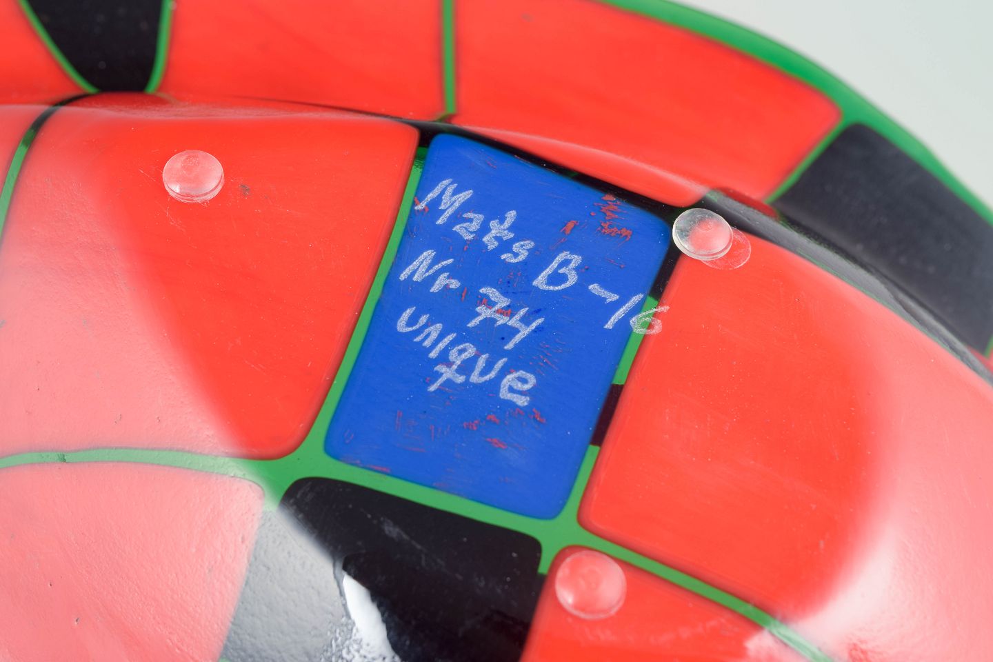 Matz Borgström, unique glass sculpture. Approx. 1980s.Organic-shaped piece of art glass with a geometric, mosaic-like composition in deep tones; made as a unique work and numbered. The reverse shows a handwritten signature and the notation “Unique no. 74”.
