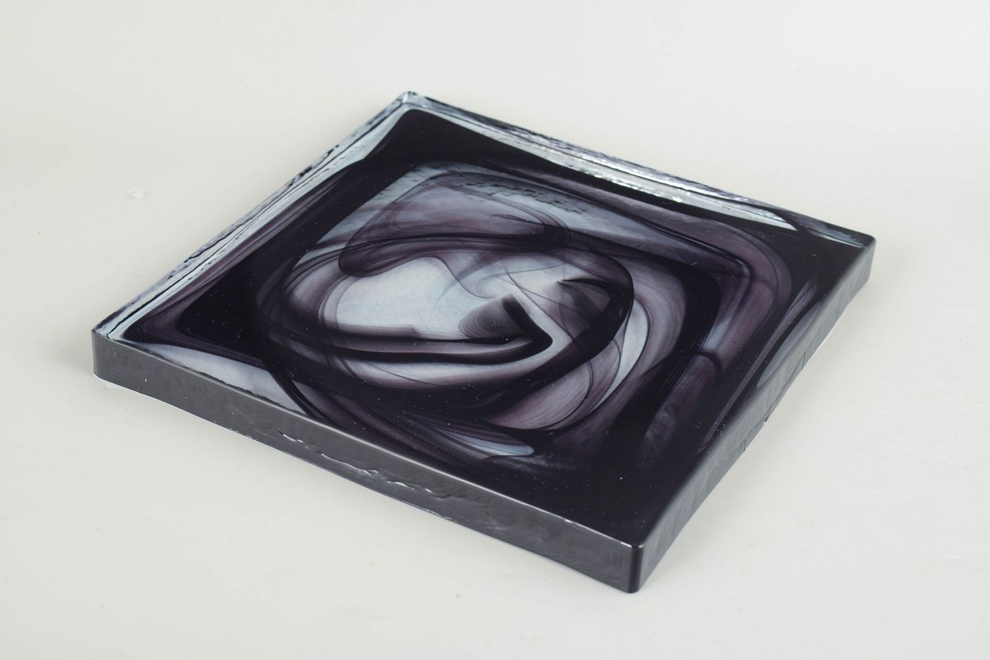 Kosta Boda, Cirrus Black, art glass object.Flat, square object in clear glass with embedded swirling black and grey glass threads forming an abstract cirrus-like pattern. The model is known as Cirrus Black.