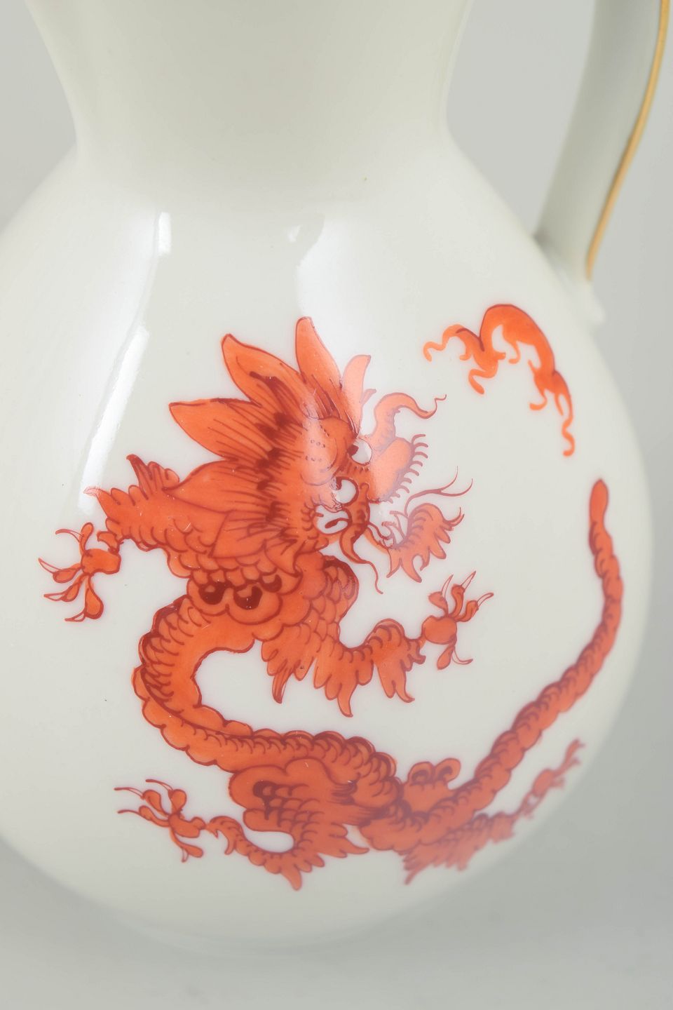 Jug with Ming dragon, Meissen area.Baluster-shaped jug in white-glazed porcelain decorated with a red Ming dragon and a gilt rim. The model was produced in the Meissen area and is not made by the Royal Meissen manufactory.
