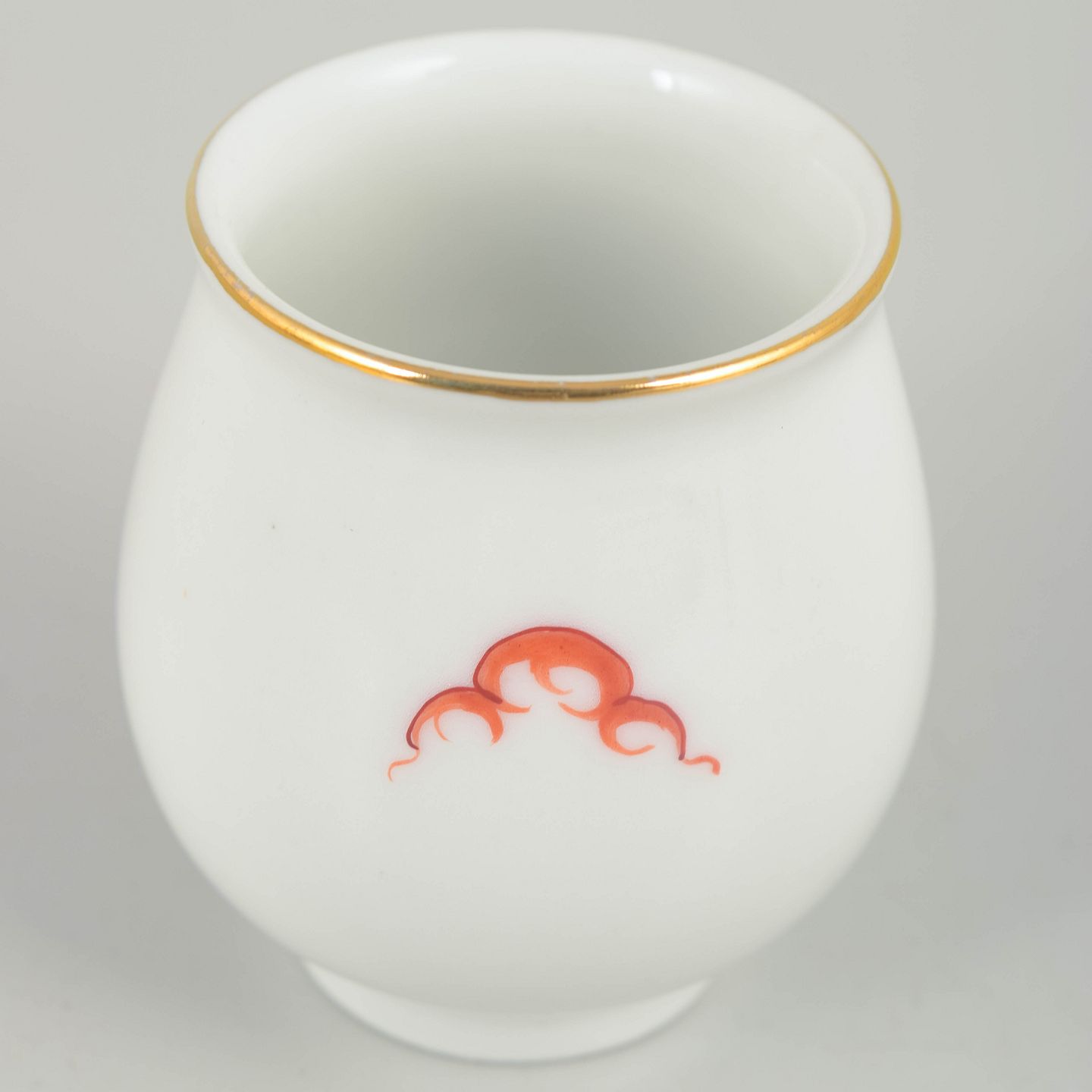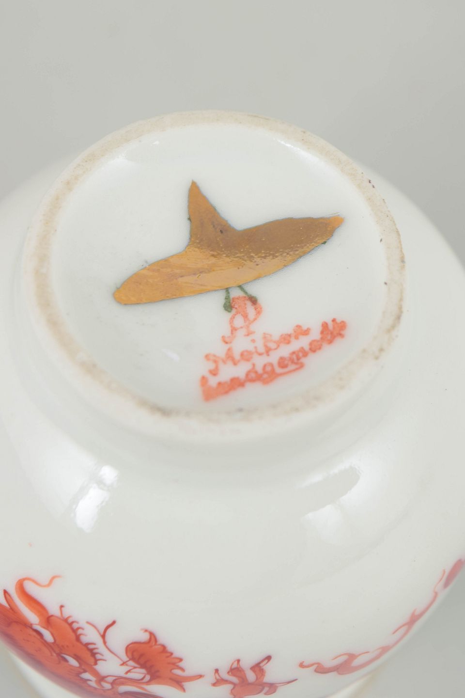 Small vase with Ming dragon, Meissen area.Small baluster-shaped vase in white-glazed porcelain decorated with a red Ming dragon and a gilt rim. The model is marked to the base and was produced in the Meissen area, but not by the Royal Meissen manufactory.