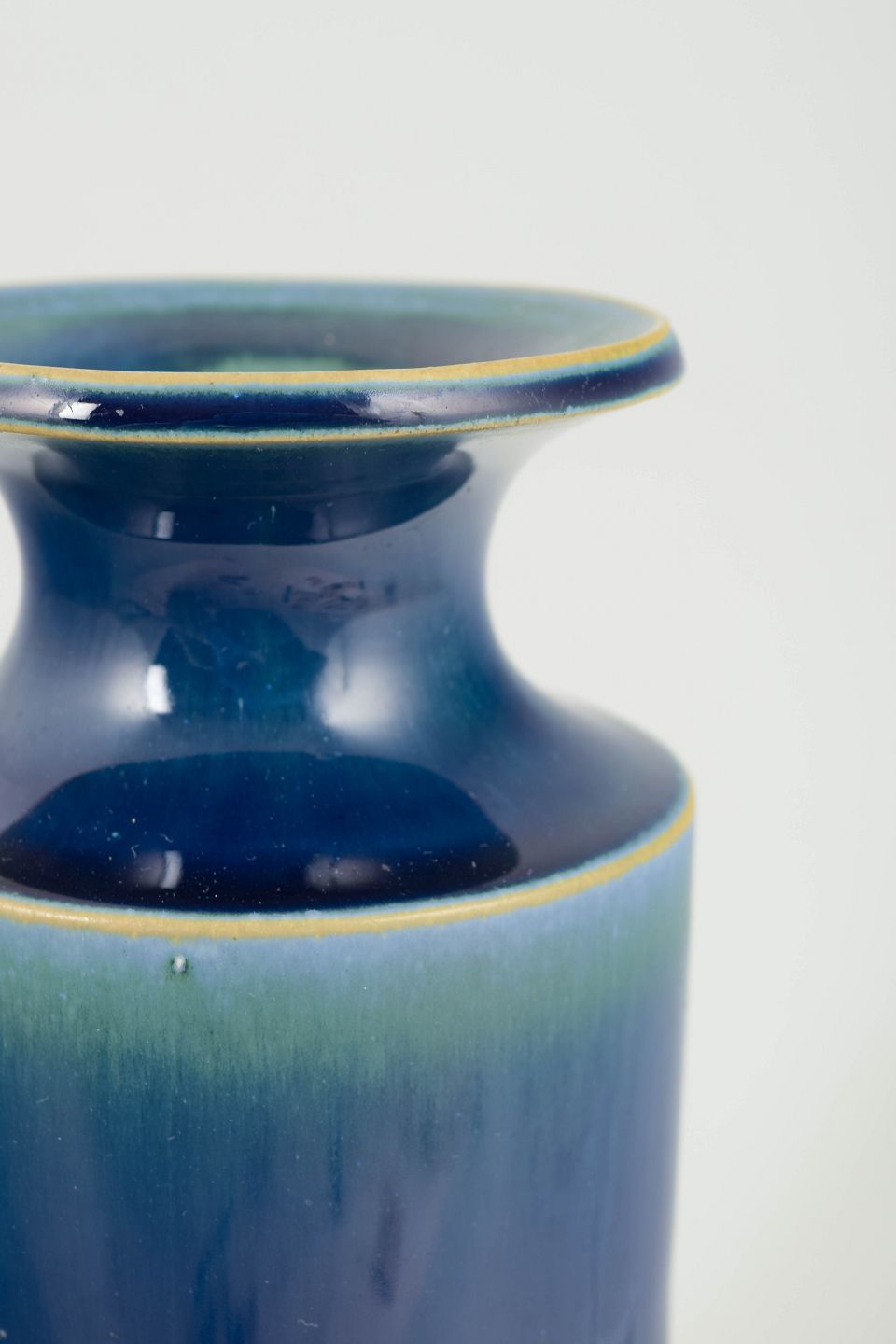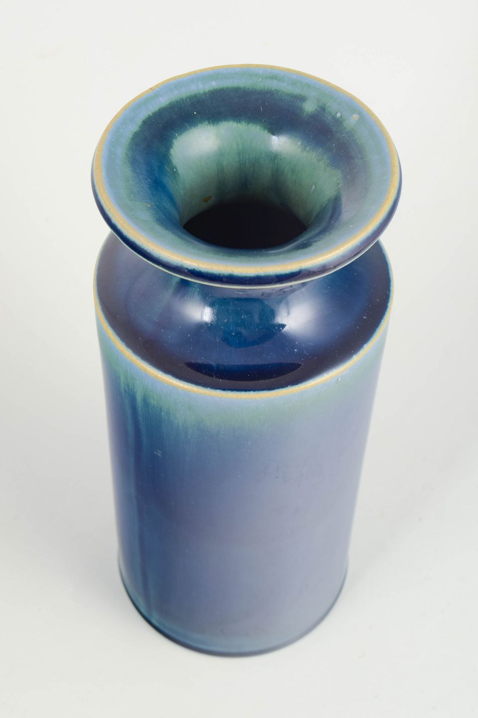 Cylindrical stoneware vase with a deep blue glaze and a subtle greenish hue towards the neck and rim; bearing Gustavsberg mark and label to the underside.