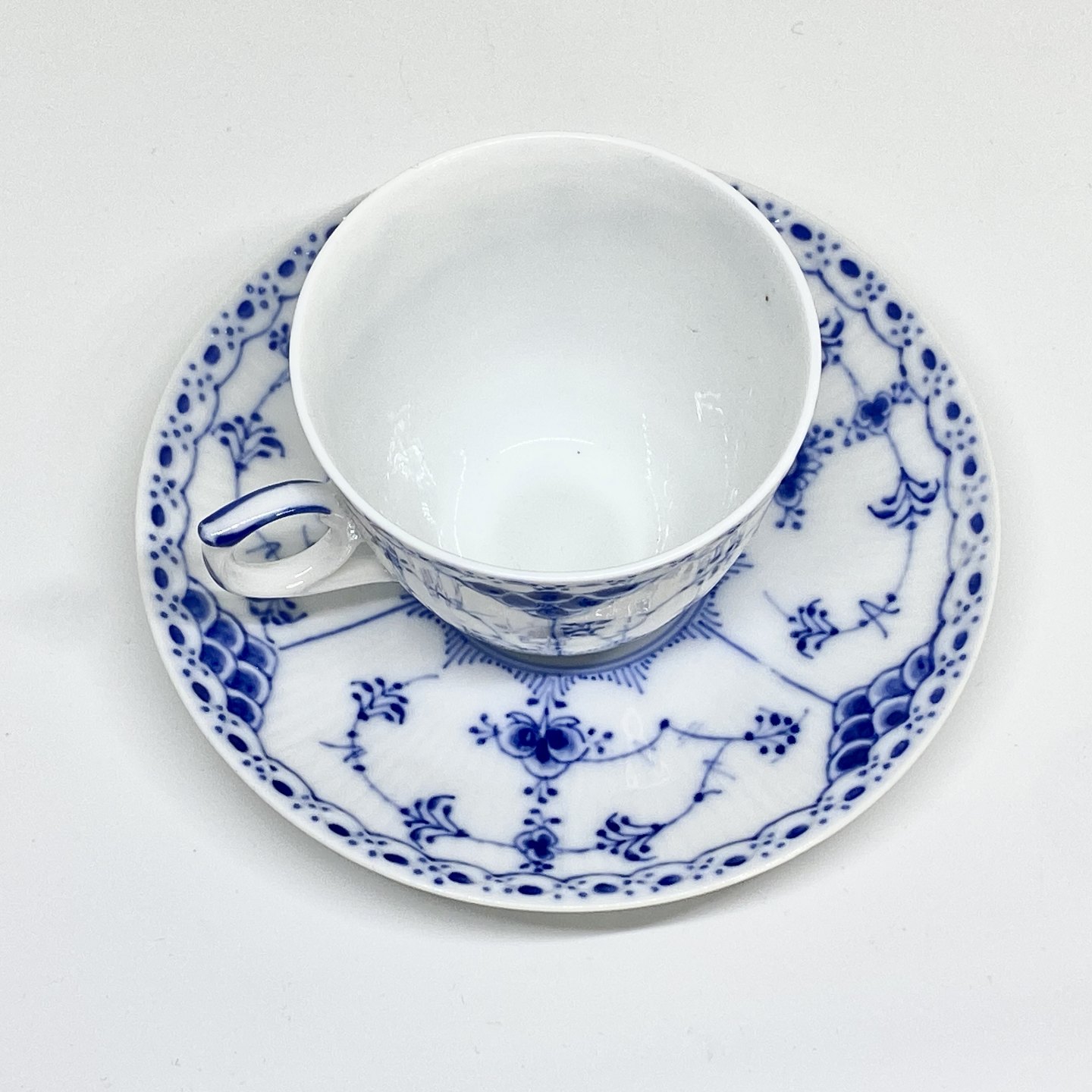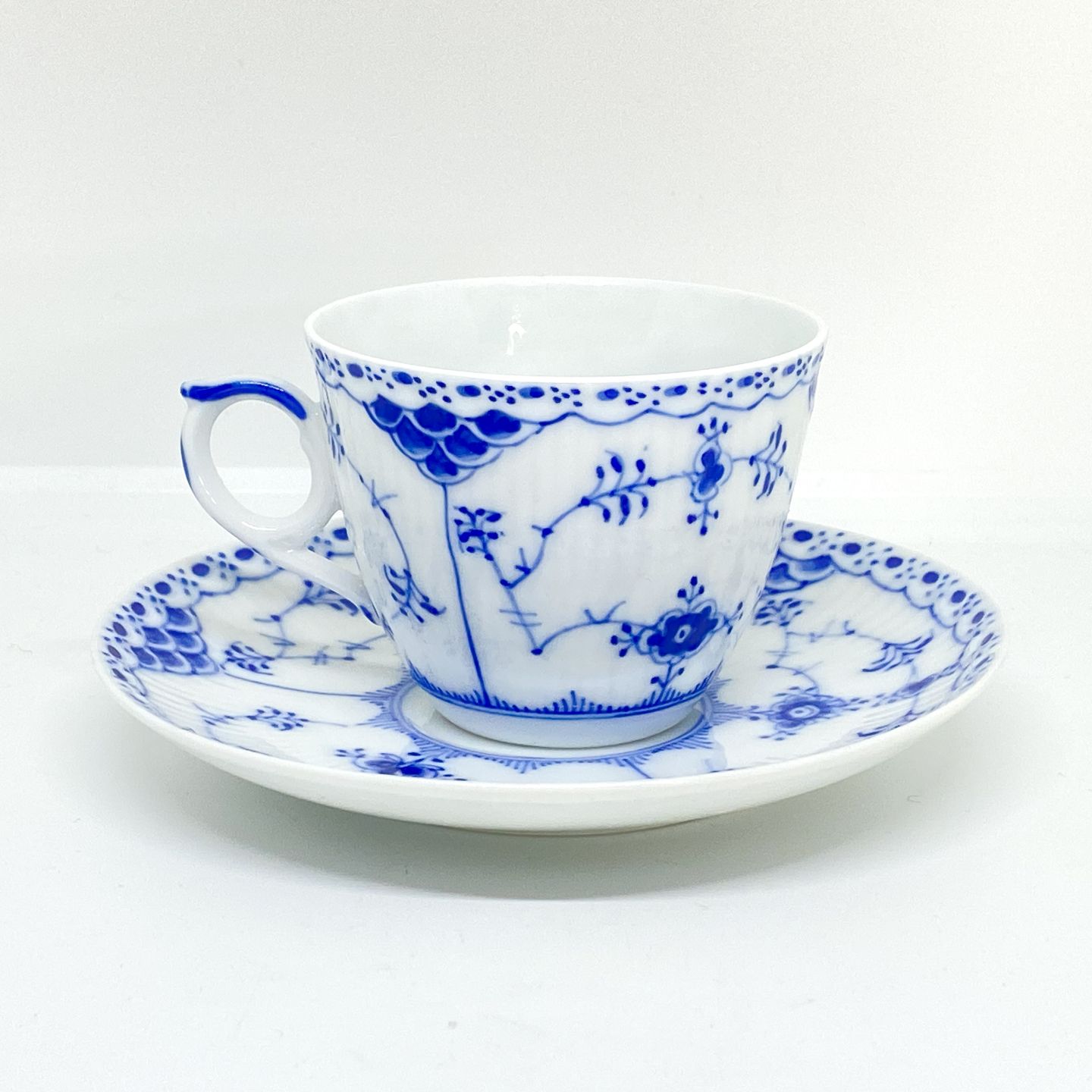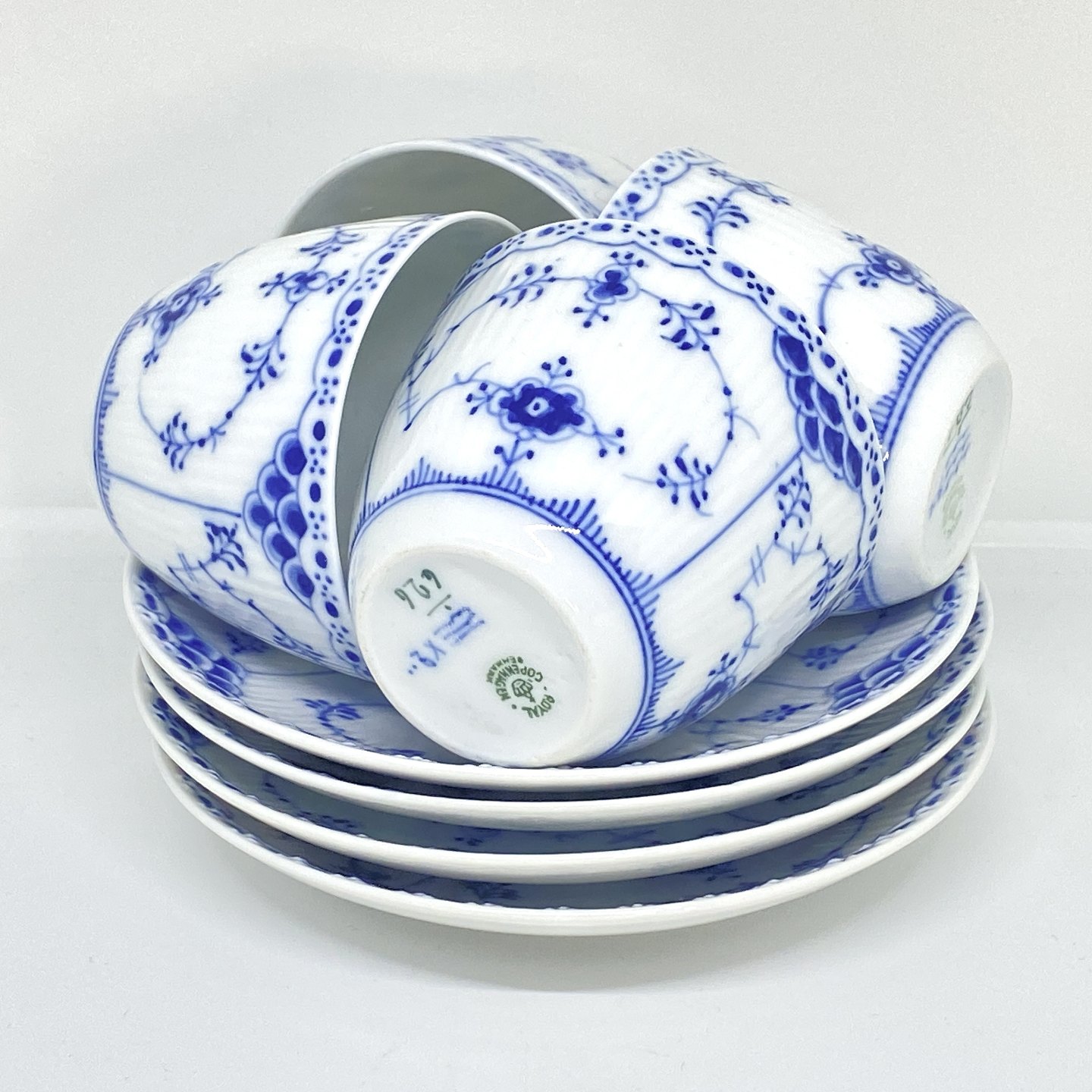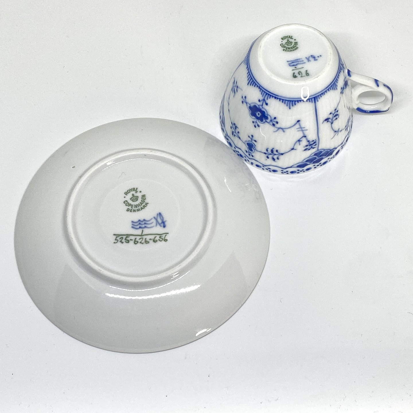 Royal Copenhagen/Kgl Blue Fluted half lace coffee cup and saucer. Decoration number cup 1/626. Decoration number saucer 1/626-525-656-669.3 sorting. Price per set - A cup with saucer. 100kr (4pcs in stock).Item number: Kgl 166