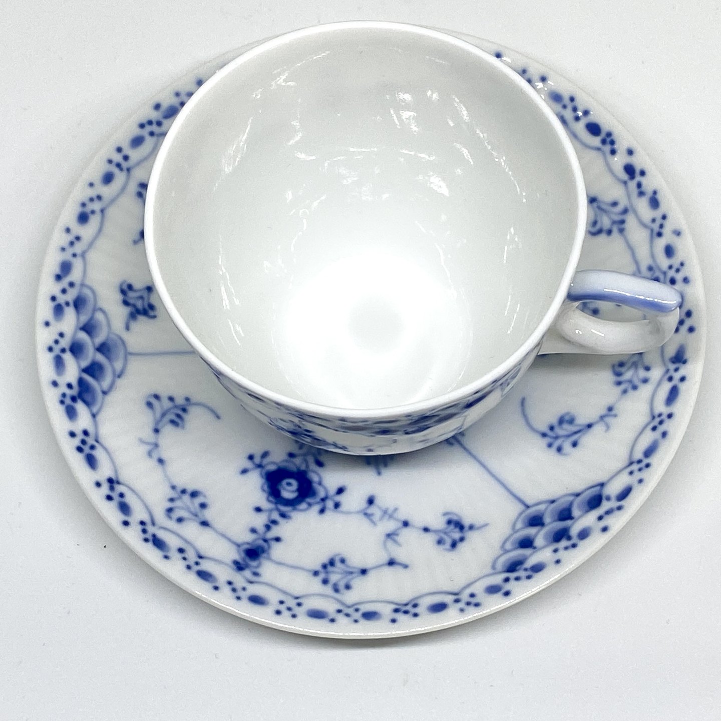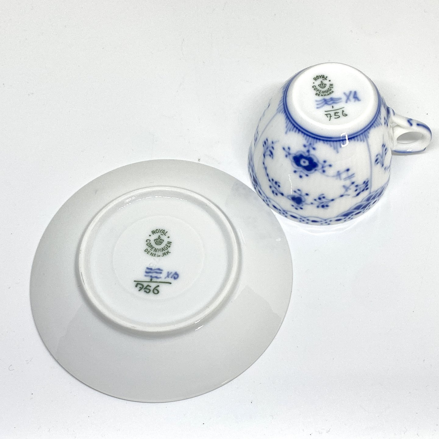 Royal Copenhagen/Kgl Blue Fluted half lace coffee cup and saucer. Decoration number cup 1/756. Decoration number saucer 1/756.3 sorting.Item number: Kgl 167