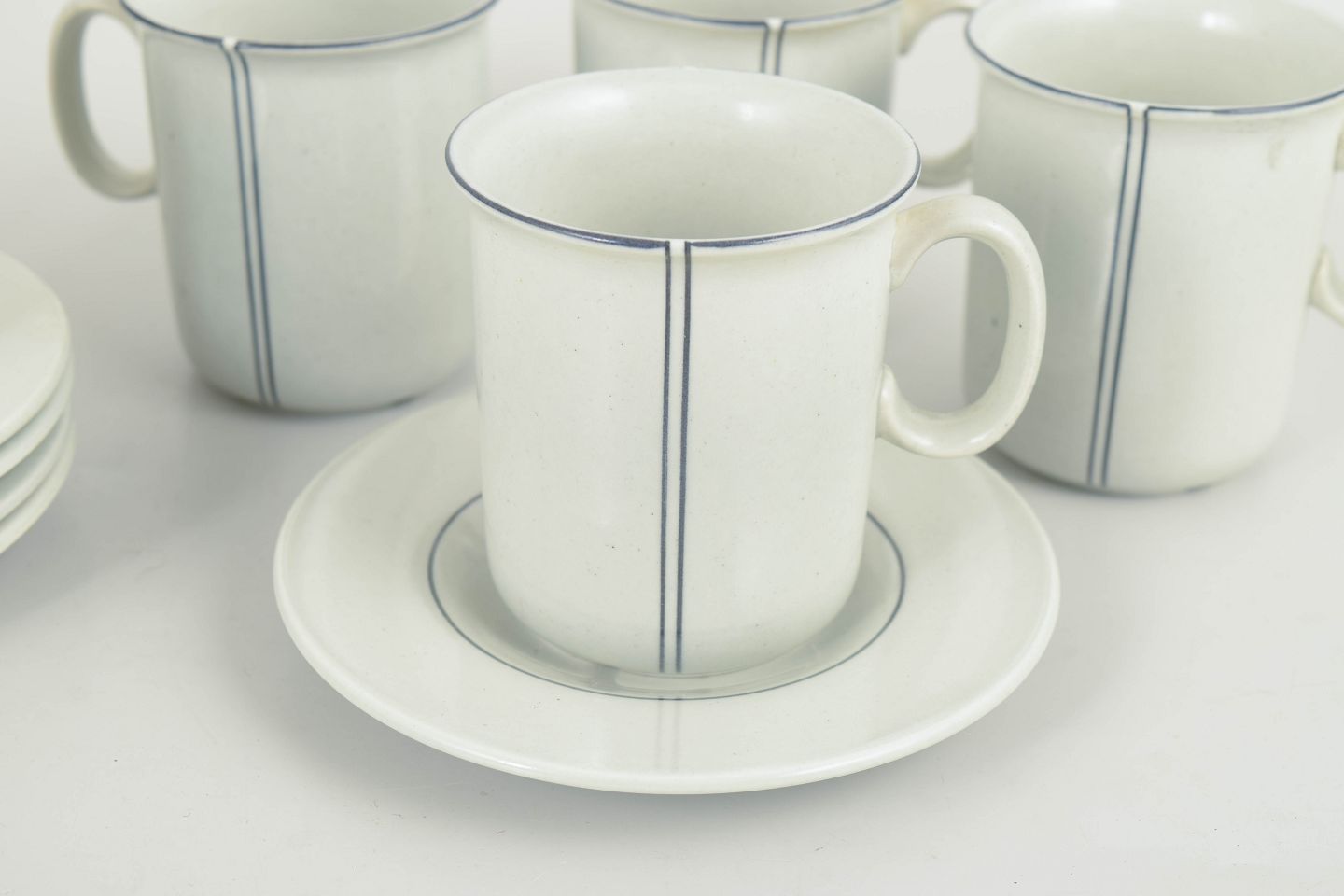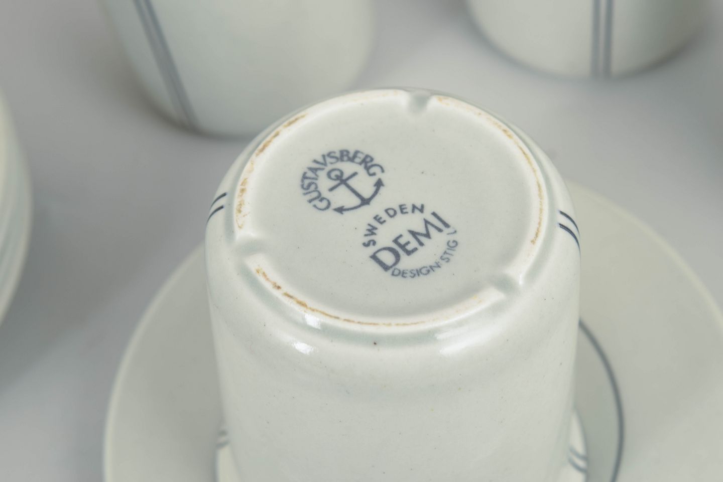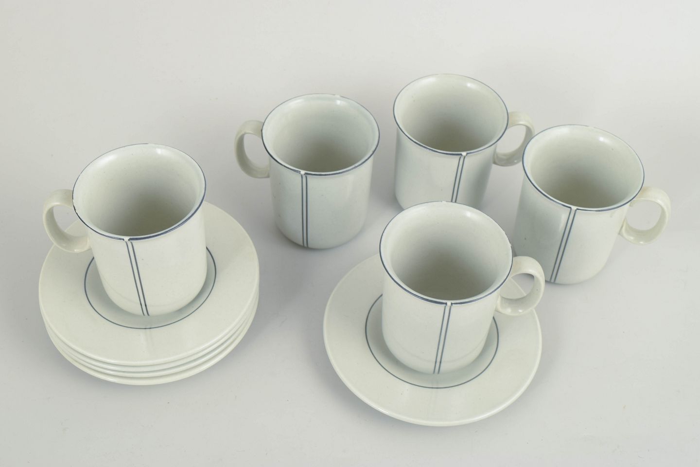 Stig Lindberg for Gustavsberg, "Demi" coffee mugs with saucers, set of five.Simple cylindrical coffee mugs in faience with white glaze and discreet vertical blue line decoration, produced in the “Demi” model.