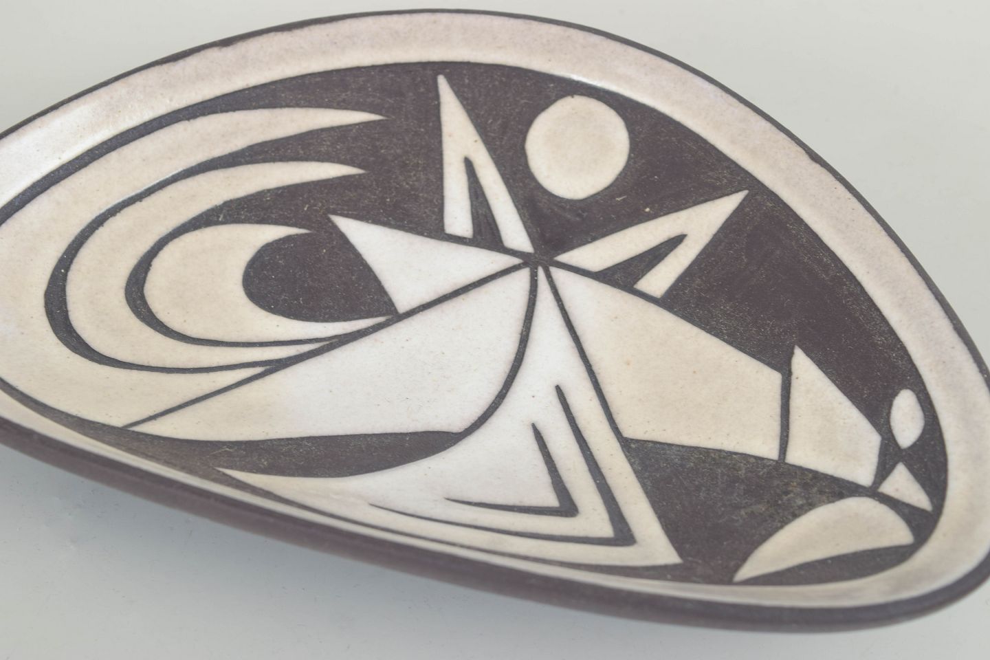 Michael Andersen, Bornholm, bowl.Triangular stoneware bowl/dish with a low profile and a bold graphic abstract decoration in black on a white ground. The design has a clean modernist look with high-contrast shapes and stylised forms. Model 5516, impressed to the base.