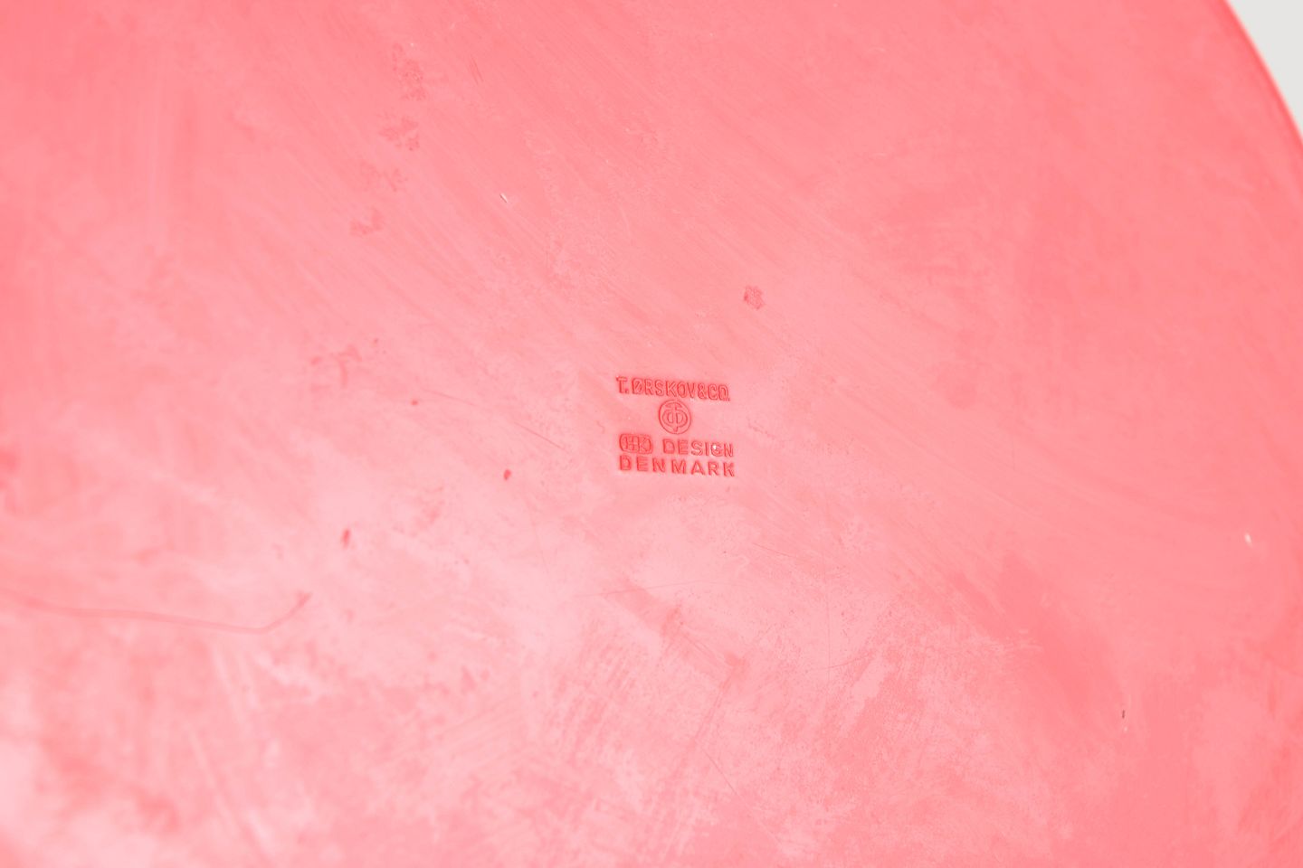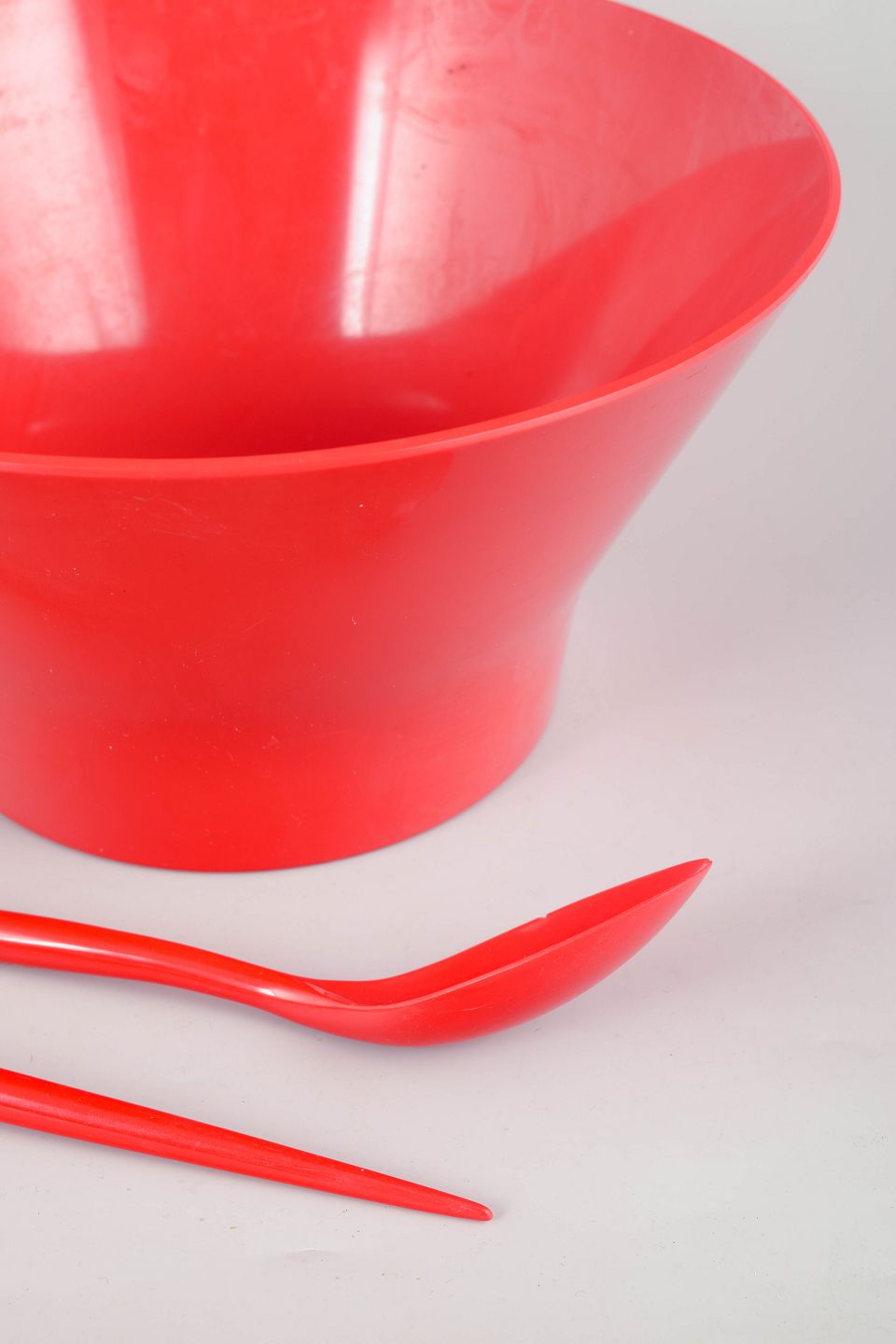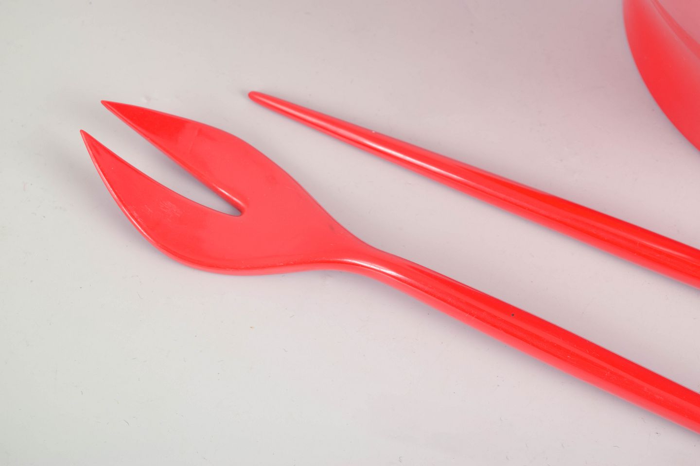 Henning Koppel for Torben Ørskov, salad bowl with serving utensils.Organic-shaped salad bowl in red plastic with matching serving spoon and fork. Stamped to the underside “T. Ørskov & Co” and H. K. Design Denmark”.