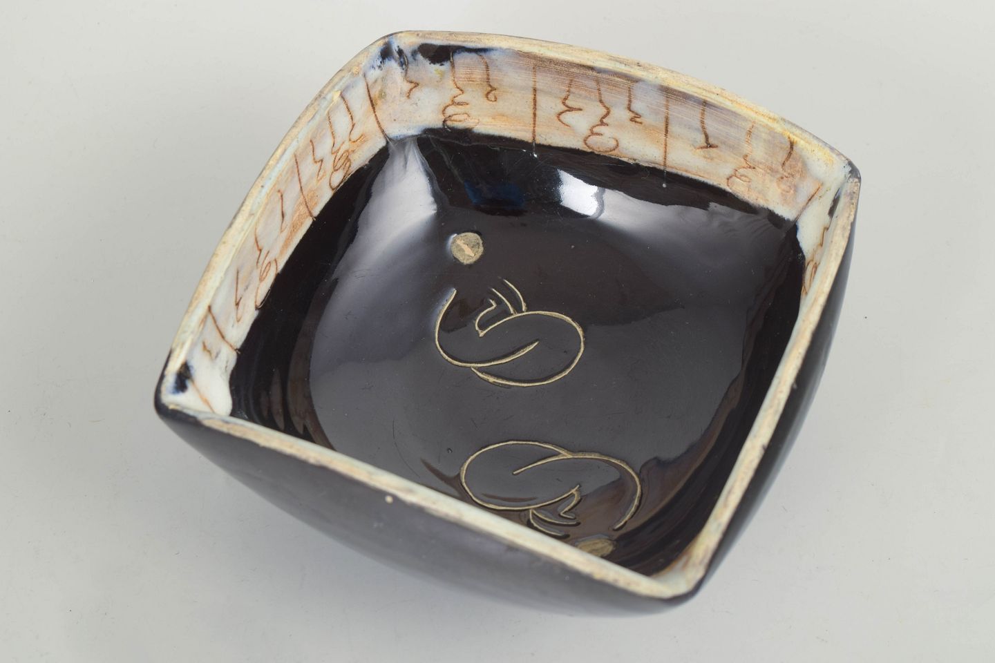 Atelier A Cérenne, Vallauris, bowl.Organically shaped ceramic bowl with an asymmetrical, slightly faceted rim. Dark glossy glaze to the exterior and a light interior with brown drip effects and a fine crackled appearance.