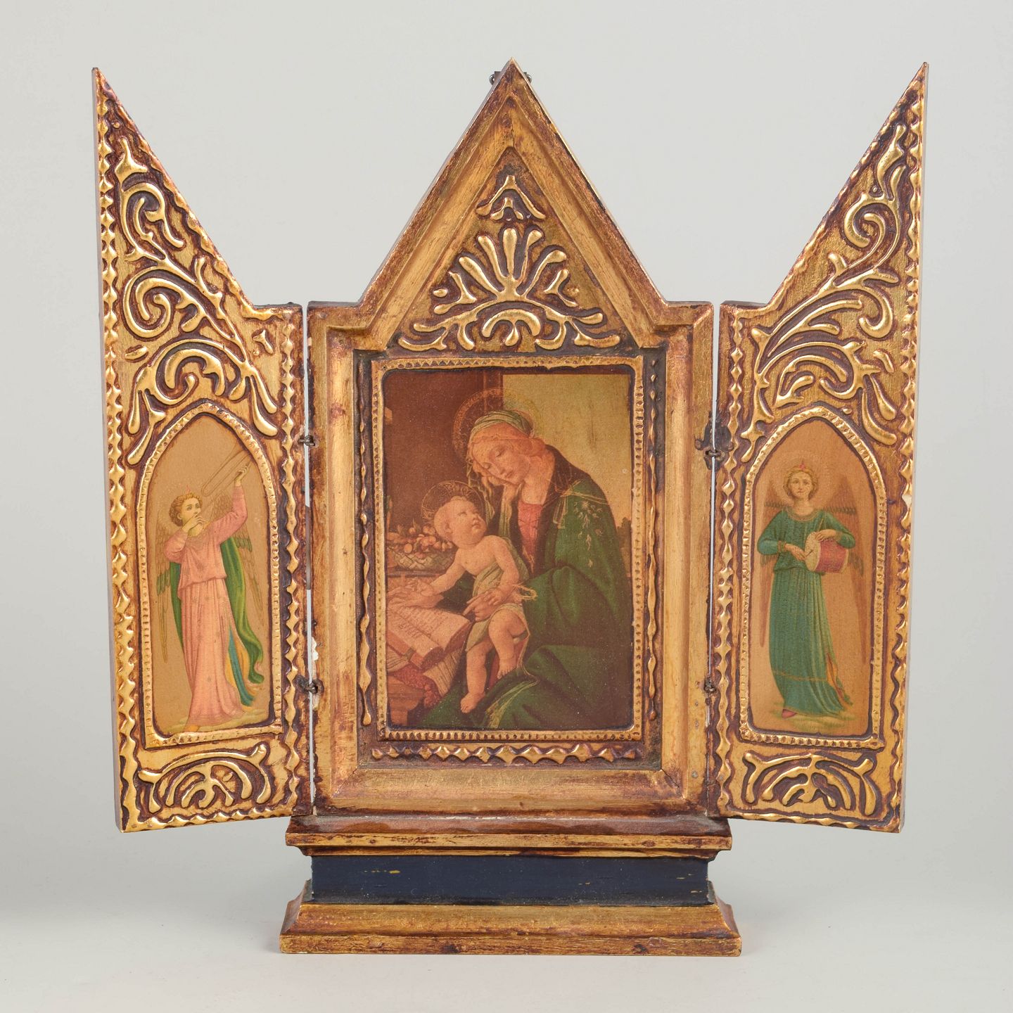 Antique Russian icon triptych, 19th century.Folding triptych with a central icon of the Madonna and Child, flanked by saint figures on the wings. Painted on wood with a gilded, ornamented frame.