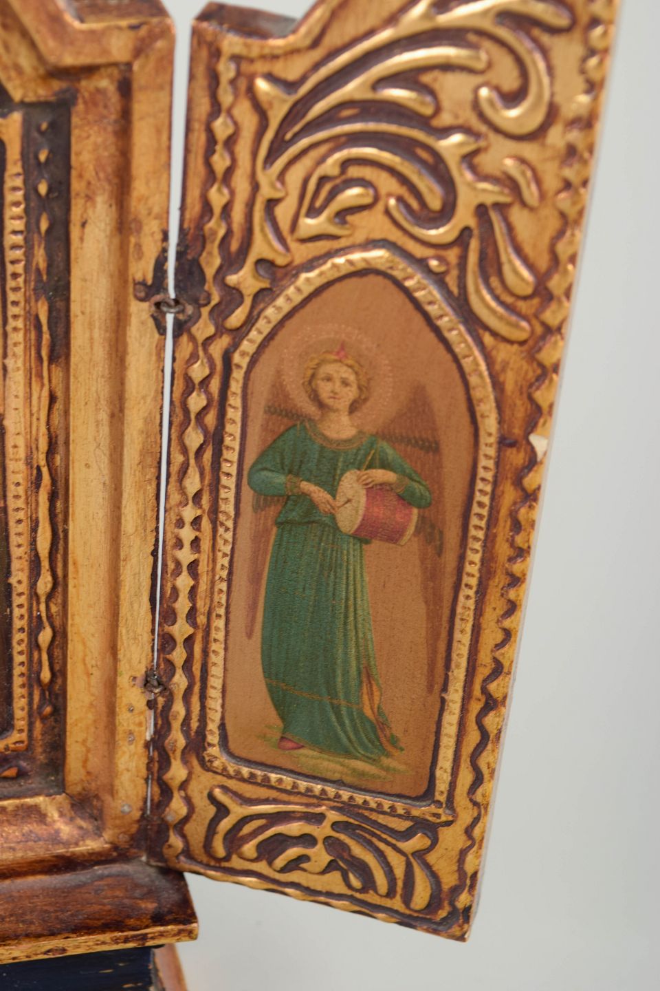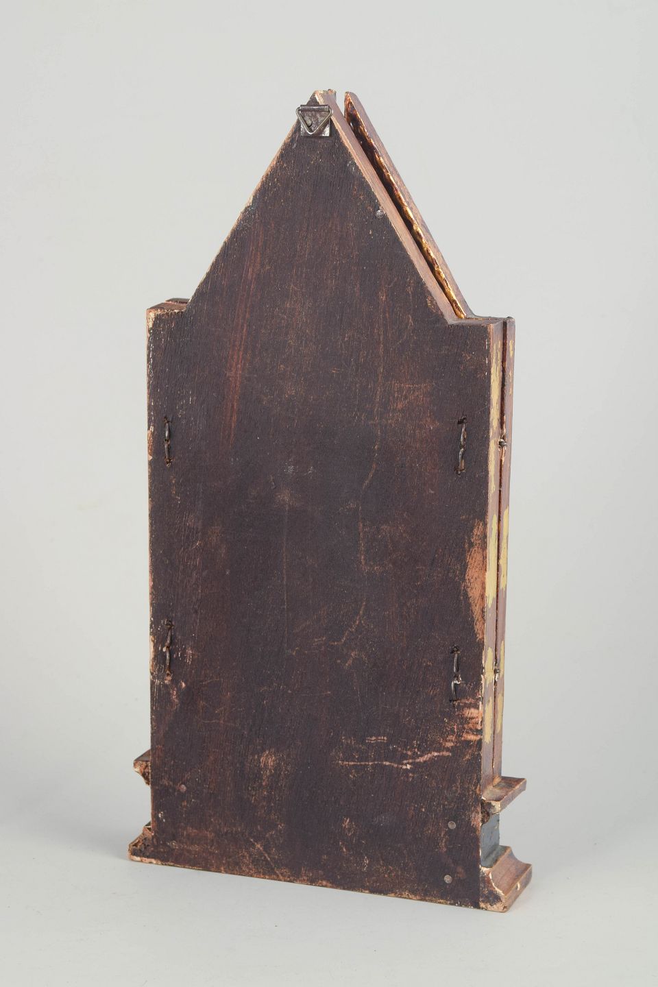 19th-century Russian Orthodox icons were often made as portable folding triptychs, with protective wings that suited private devotion and travel. The combination of devotional symbolism, frontal figures, and decorative gilding is characteristic of the tradition, giving the piece a distinct liturgical and cultural-historical presence.