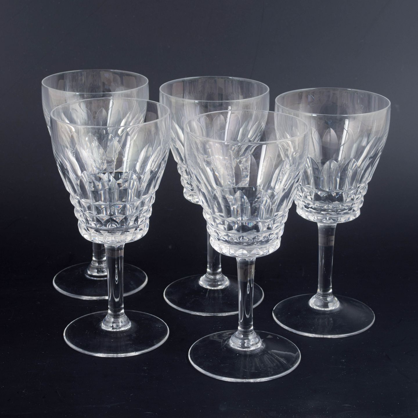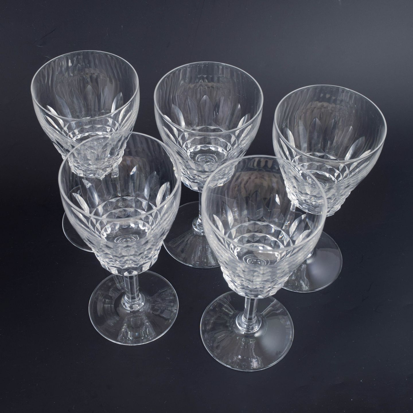 French Crystal, Set of 5 Red Wine Glasses.Set of five French red wine glasses in clear crystal, featuring a faceted bowl and a classic stem. The cut surfaces catch the light beautifully, giving a refined mid-20th-century look.