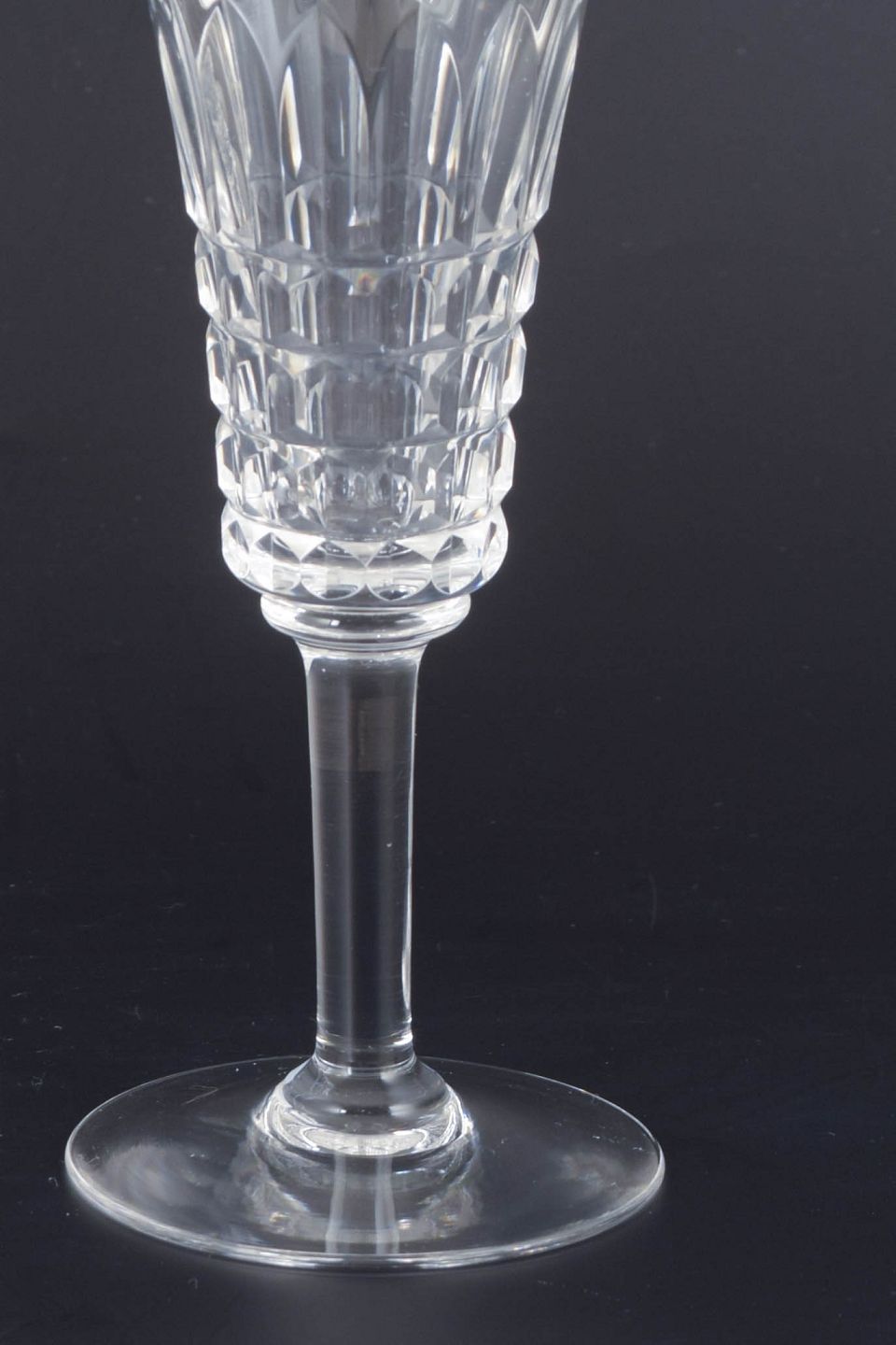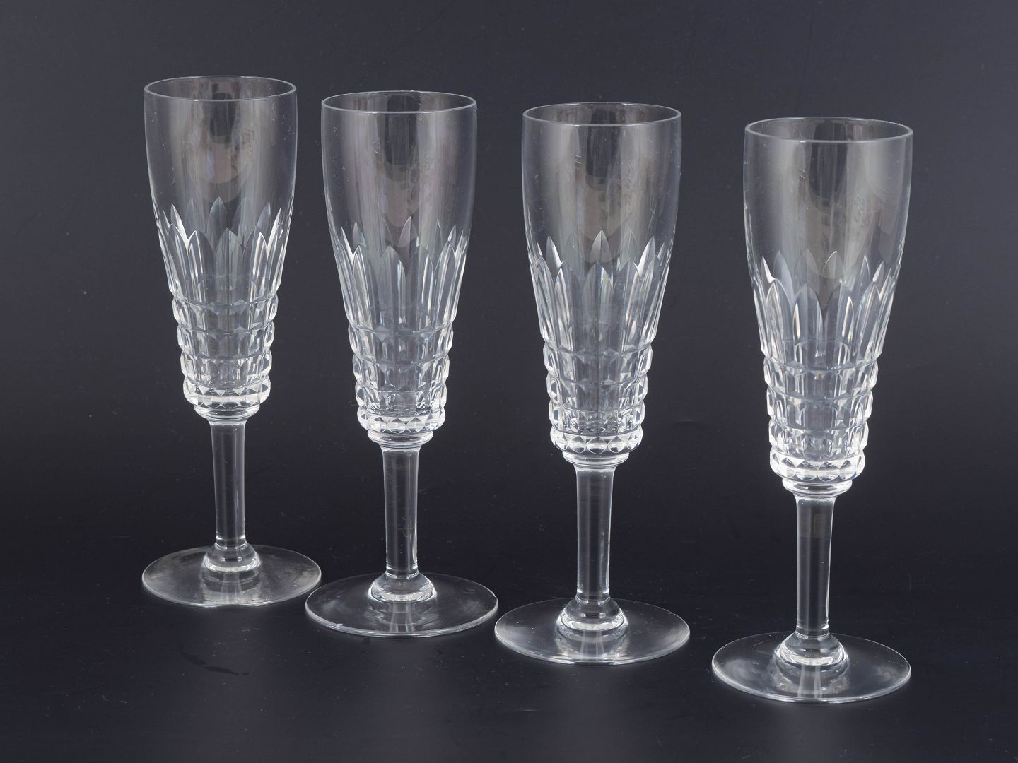 Mid-20th-century French crystal glassware is often defined by precise cutting and well-balanced proportions, using facets and flat planes to emphasise clarity and sparkle. Champagne glasses were a staple of formal table settings and home bars, and remain highly collectible today for their timeless elegance.