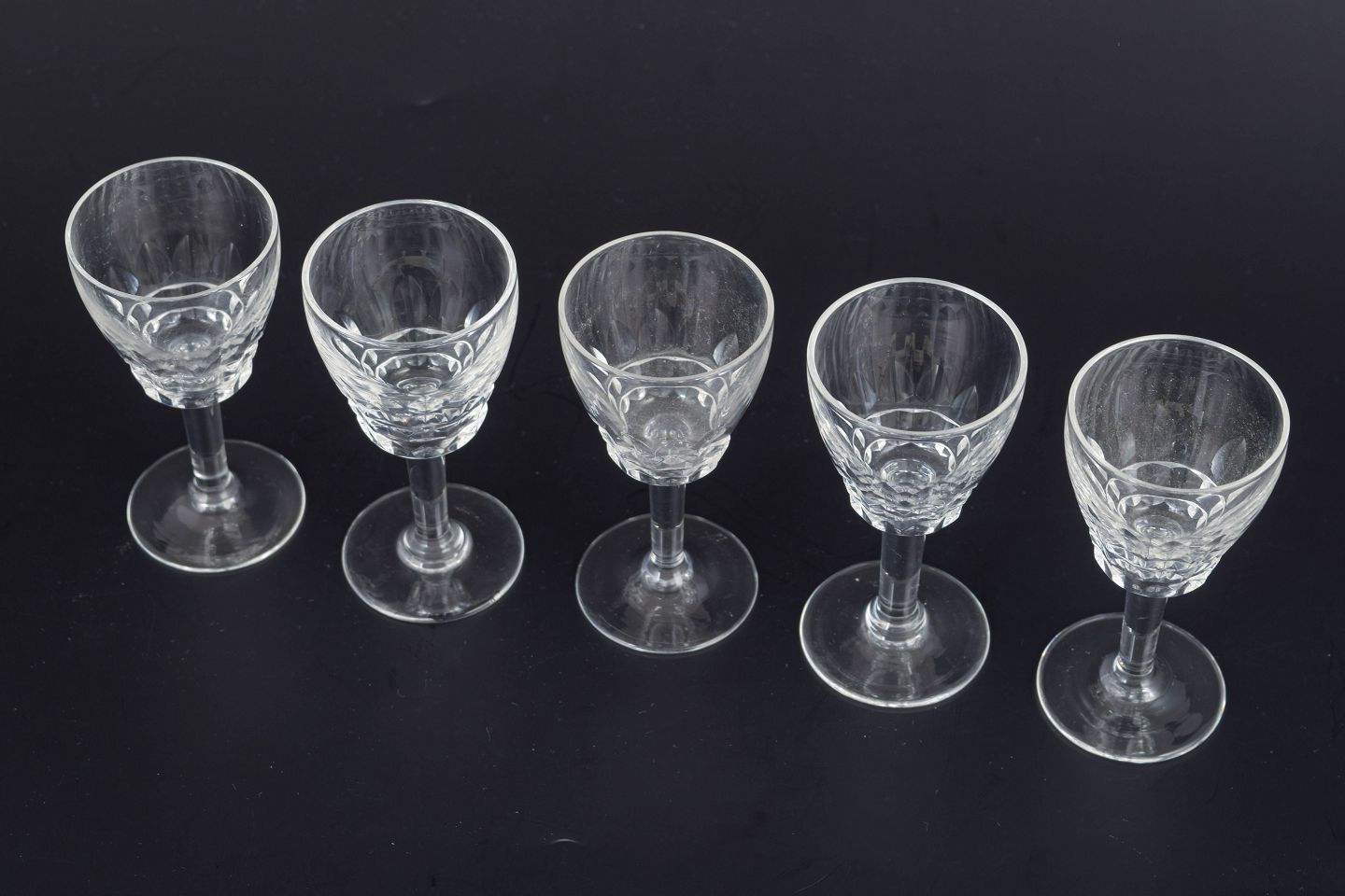 Mid-20th-century French crystal glassware is often defined by precise cutting and well-balanced proportions, using facets and flat planes to emphasise clarity and sparkle. Small schnapps glasses were a staple of formal table settings and home bars, and remain highly collectible today for their timeless elegance.