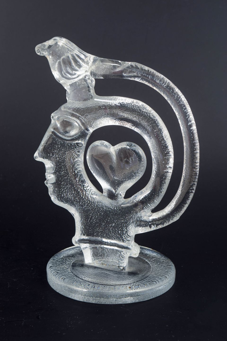Bertil Vallien for Kosta Boda, figurative glass sculpture.Sculptural form in clear solid glass with a stylised human head in profile, an integrated heart shape at the centre, and a bird figure positioned at the top of the curved structure. The surface shows lightly frosted areas and internal air bubbles, creating depth and optical effects in the glass. Unsigned.