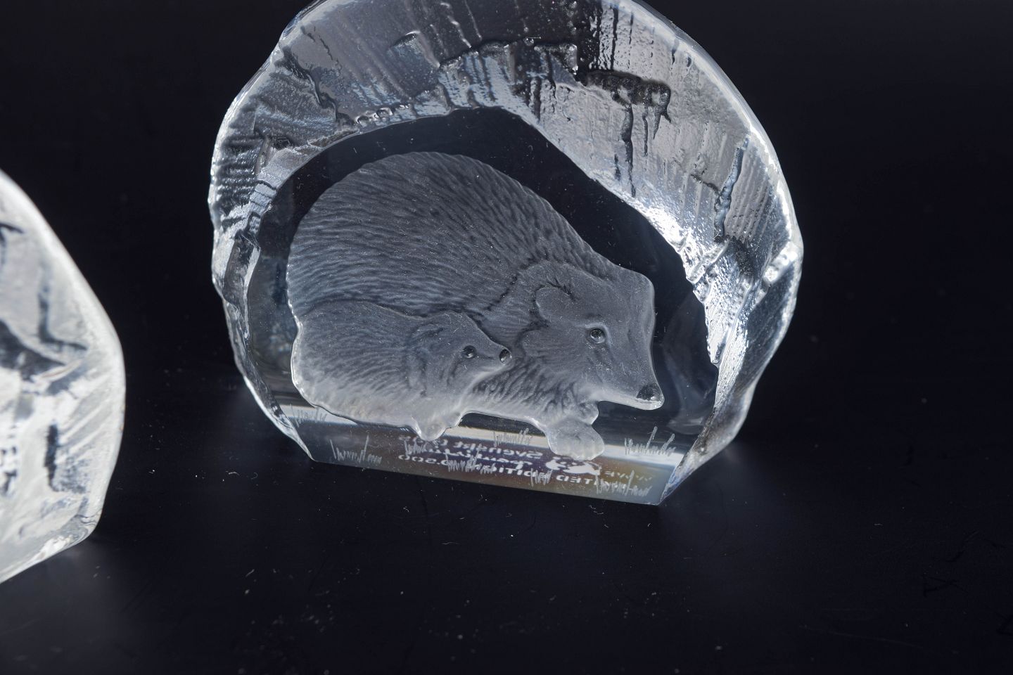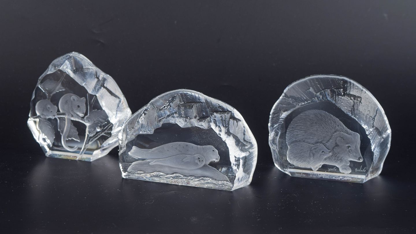 Paul Isling for Svenskt Glas, WWF figures, set of 3.Sculptural art glass sculptures with engraved animal motifs, executed in clear glass and issued as a limited edition in collaboration with WWF.