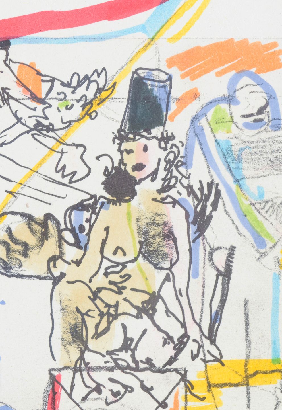 Jens Birkemose, mixed media, listed Danish artist.Abstract and figurative composition with expressive lines and areas of colour, executed in mixed media on paper. The composition combines sketch-like figures with geometric forms and transparent layers of colour. Signed.