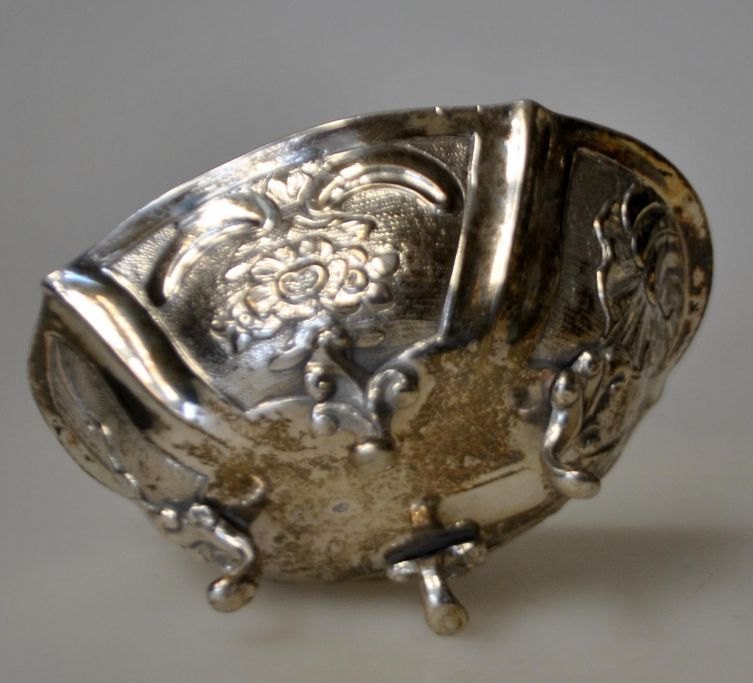Swedish rococo silver bowl, 18th century. Stamped. With four small legs and rococo decorations on the sides of flowers and rocailles. H.: 4.5 cm. L.: 9.2 cm.Item number: 28870