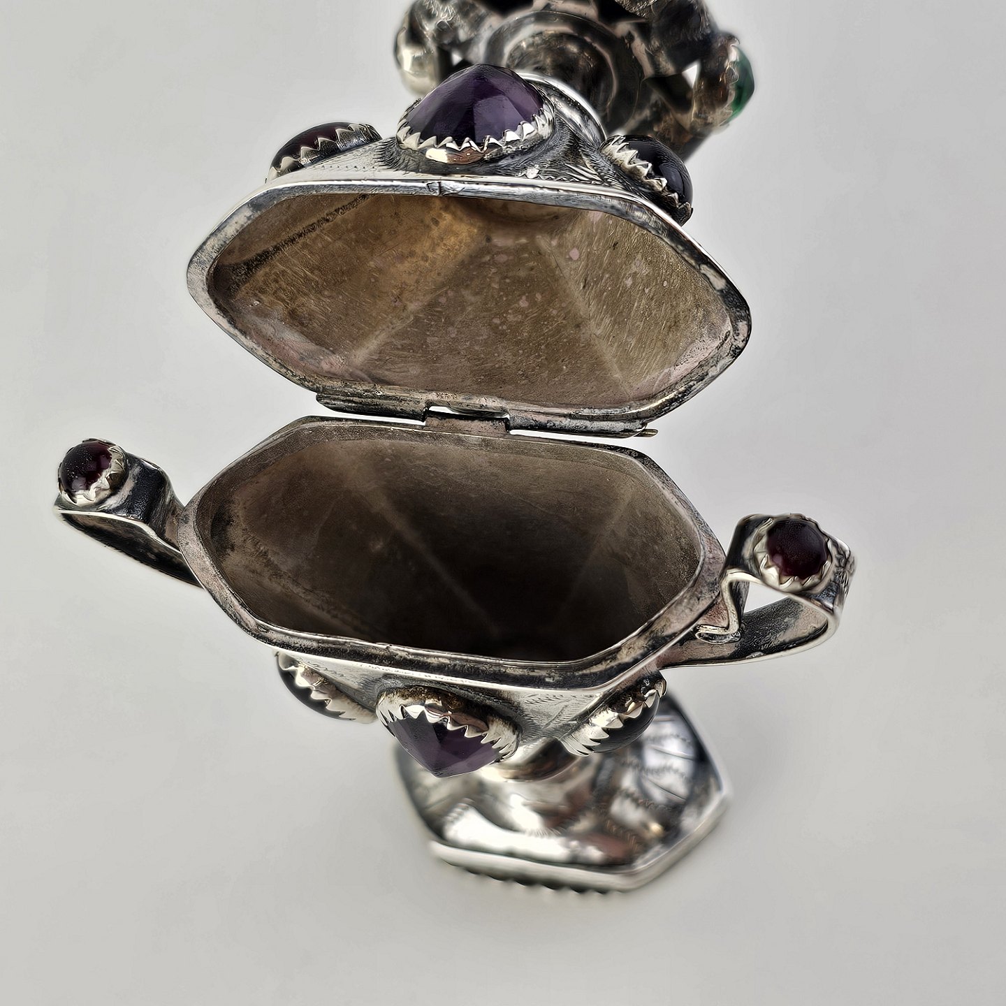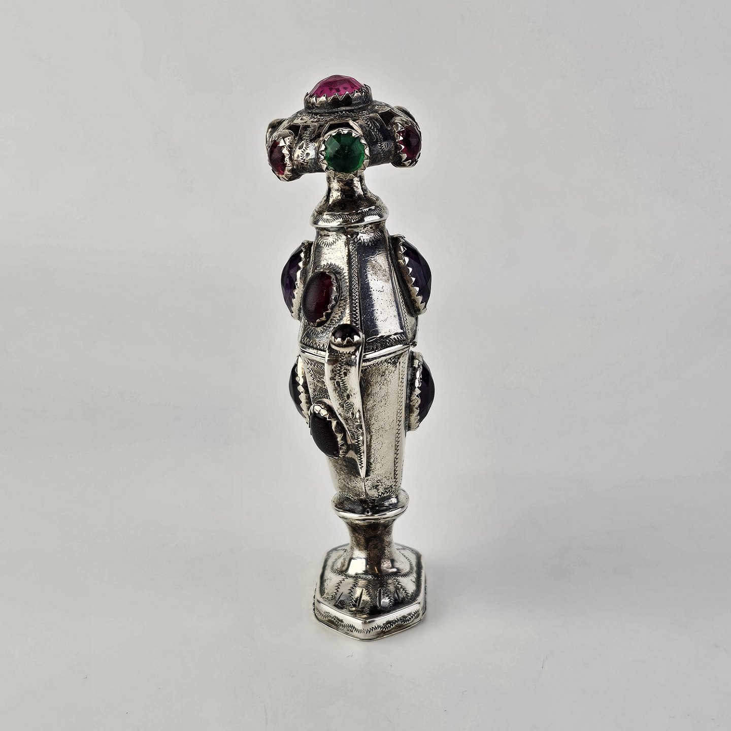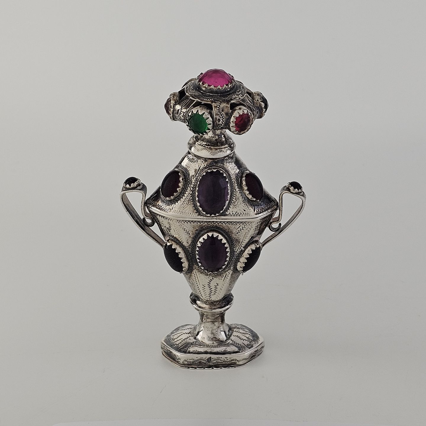 Hovedvandsæg i sølv dekoreret med forskellige smykkesten. Indgraveret under bunden med et hjerte, initialer og årstallet 1955Producent ukendt, stemplet muligvis CG
